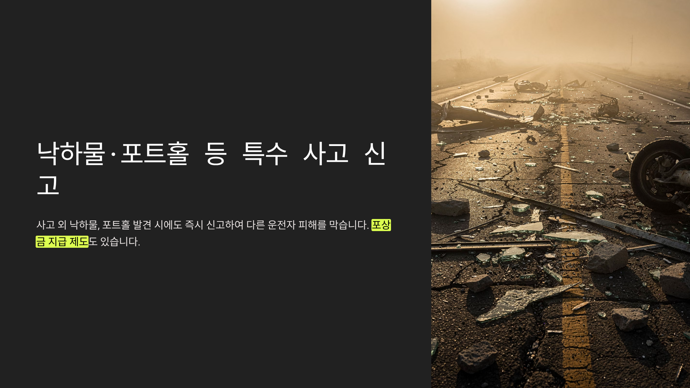 사고 외 낙하물, 포트홀 발견 시에도 즉시 신고하여 다른 운전자 피해를 막습니다. 포상금 지급 제도도 있습니다.