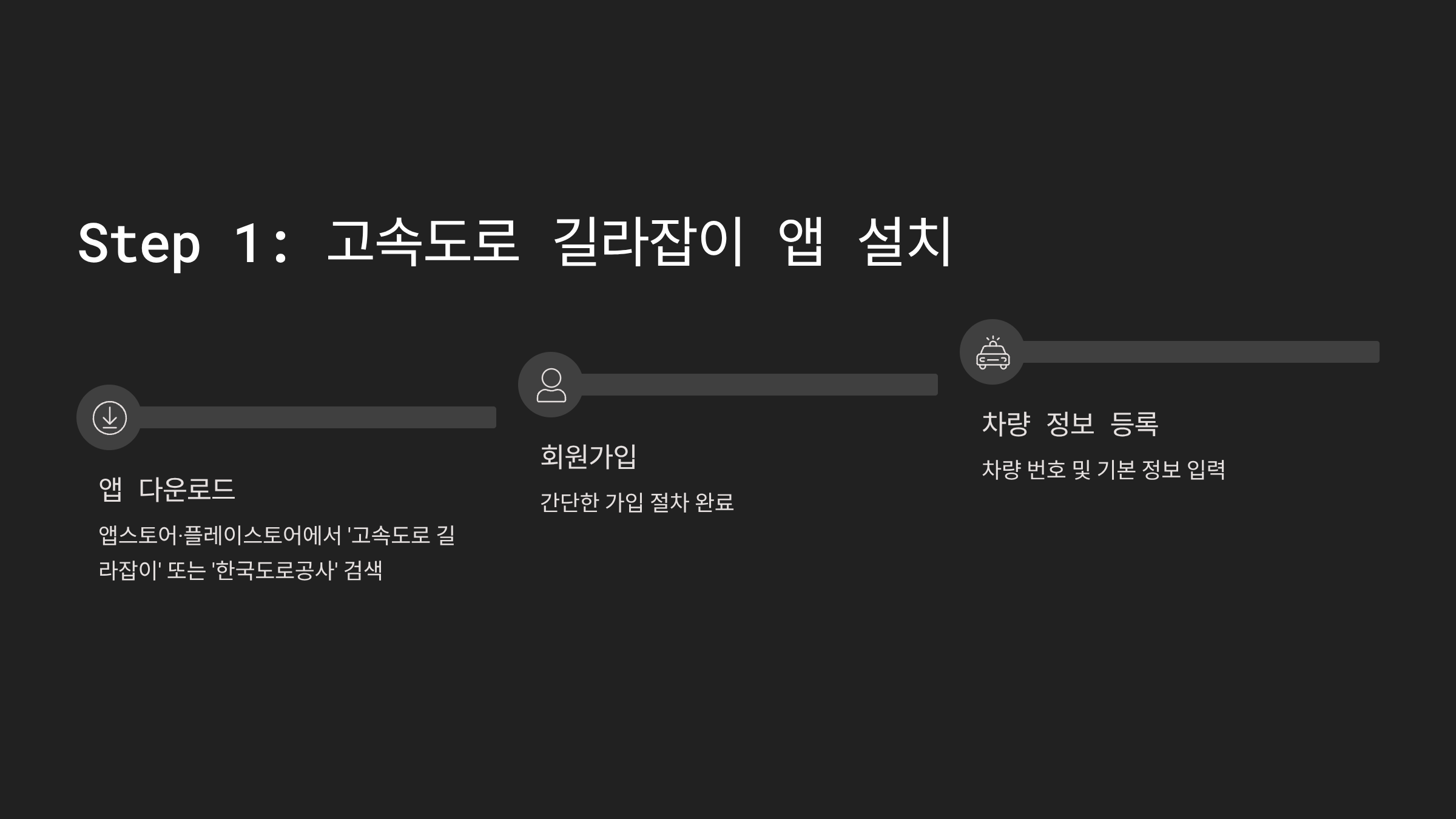 앱스토어·플레이스토어에서 '고속도로 길라잡이' 또는 '한국도로공사' 앱을 다운로드합니다. 회원가입 후 차량 정보를 등록합니다.