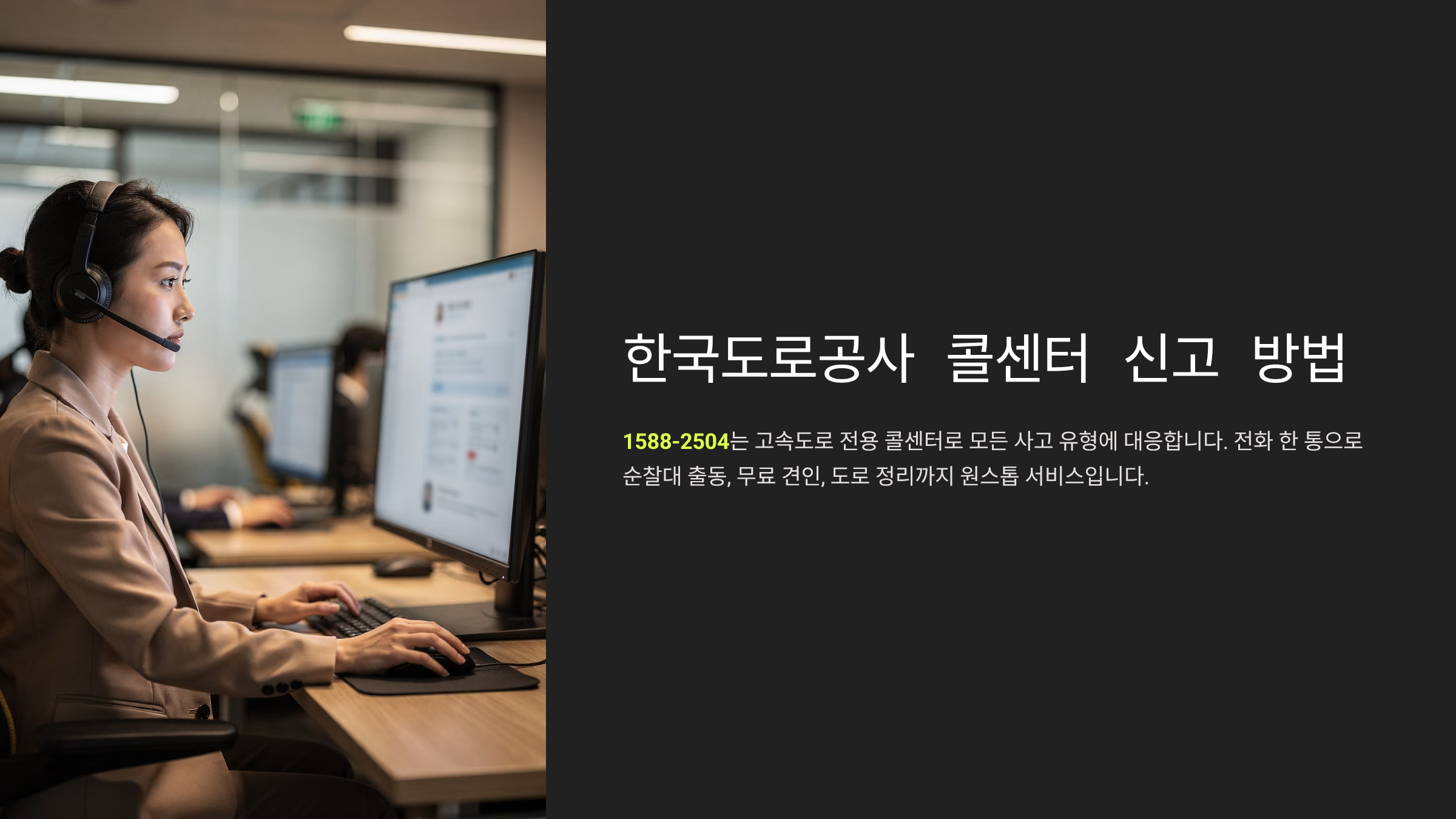 1588-2504는 고속도로 전용 콜센터로 모든 사고 유형에 대응합니다. 전화 한 통으로 순찰대 출동, 무료 견인, 도로 정리까지 원스톱 서비스입니다.