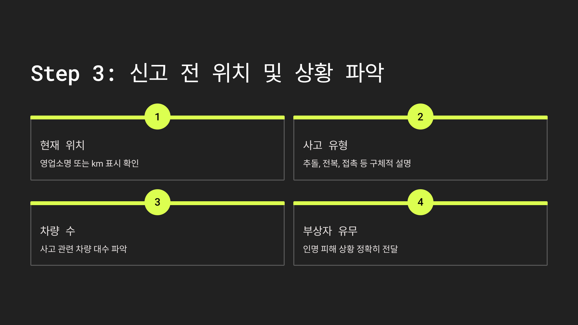신고 전에 현재 위치(영업소명이나 km 표시), 사고 유형(추돌, 전복 등), 차량 수, 부상자 유무를 간단히 정리합니다. 이 정보가 정확할수록 순찰대 출동이 빨라집니다.