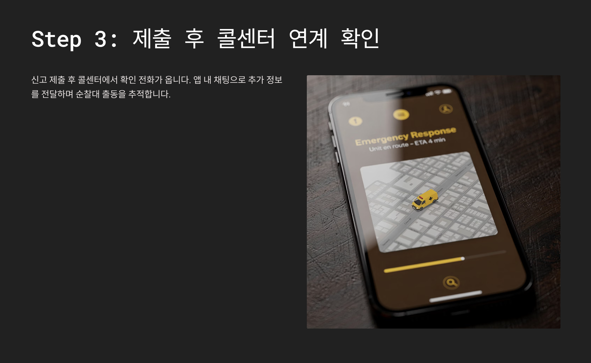 신고 제출 후 콜센터에서 확인 전화가 옵니다. 앱 내 채팅으로 추가 정보를 전달하며 순찰대 출동을 추적합니다.