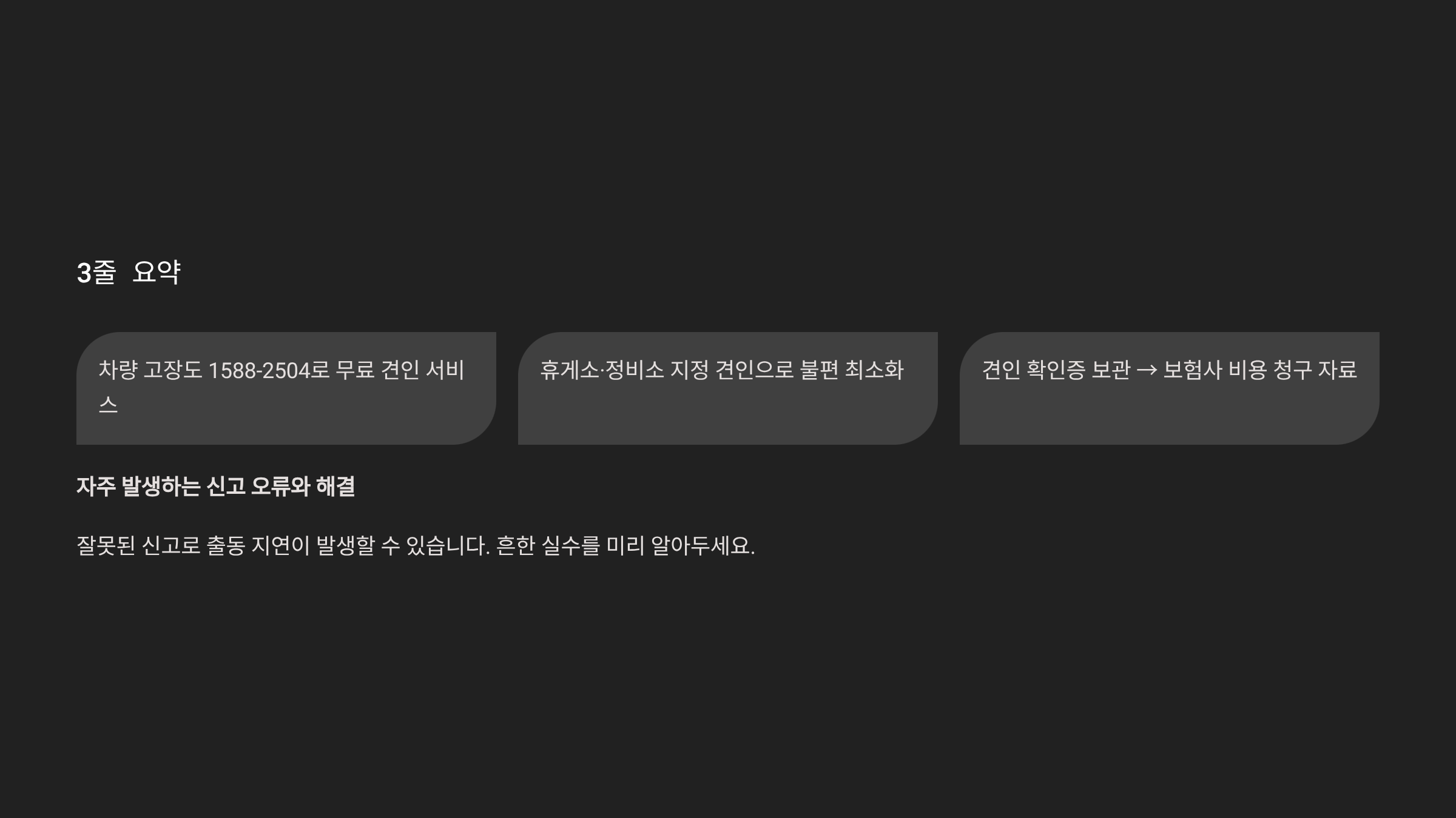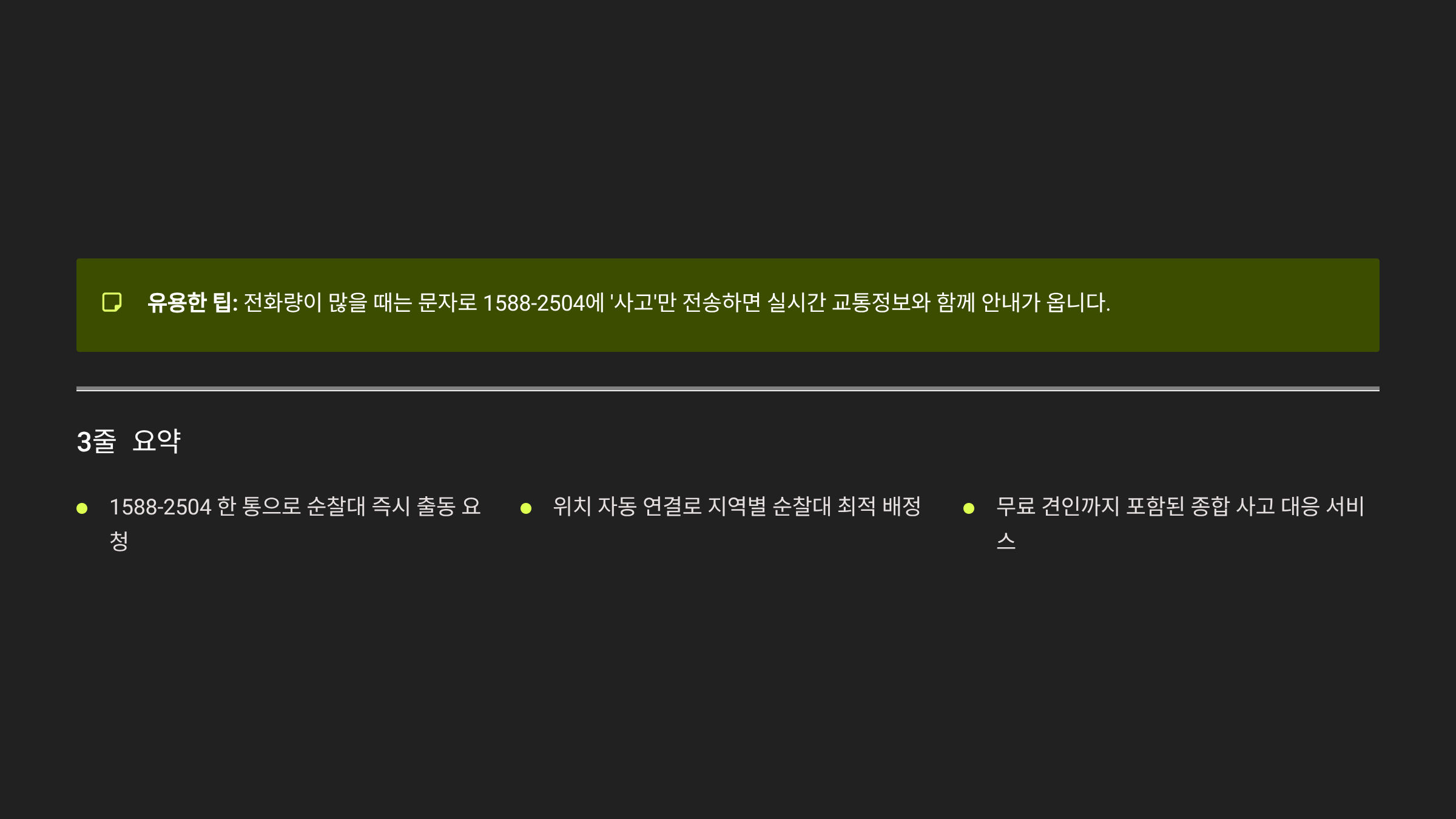 💡 유용한 팁: 전화량이 많을 때는 문자로 1588-2504에 '사고'만 전송하면 실시간 교통정보와 함께 안내가 옵니다.