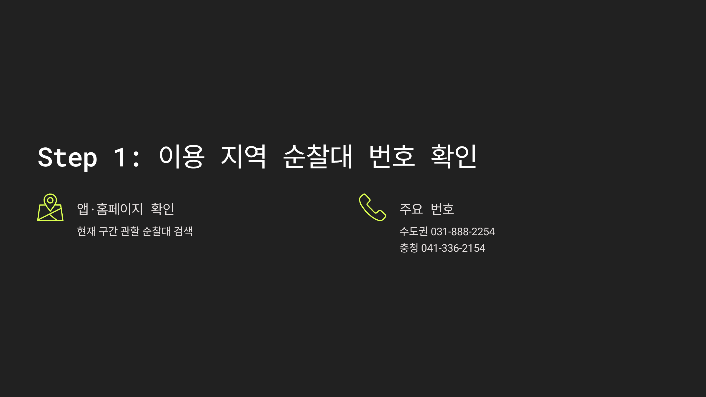 앱이나 홈페이지에서 현재 구간 관할 순찰대를 확인합니다. 예: 수도권 031-888-2254, 충청 041-336-2154 등.