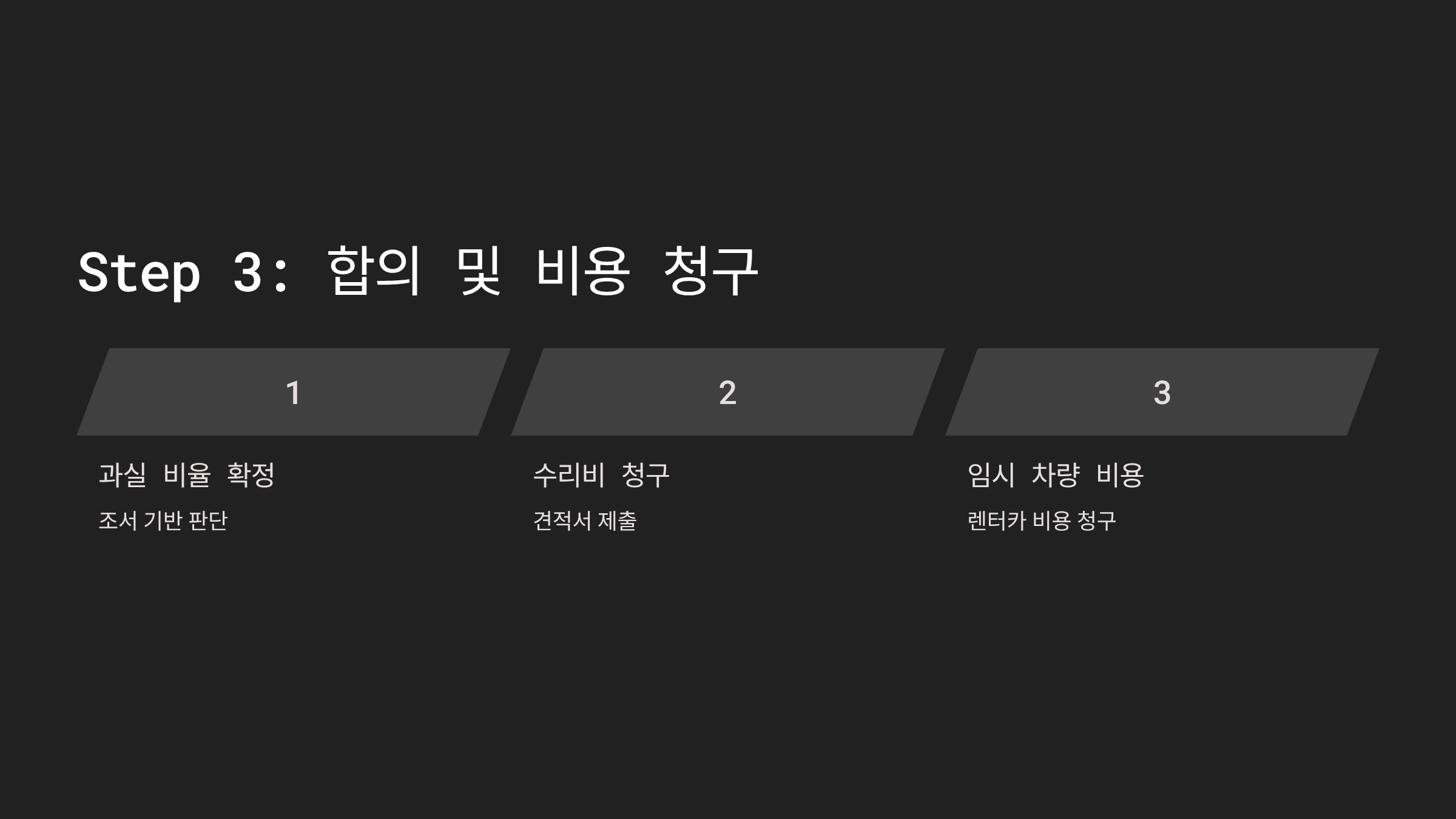 과실 비율 확정 후 수리비·임시 차량 비용 청구합니다.