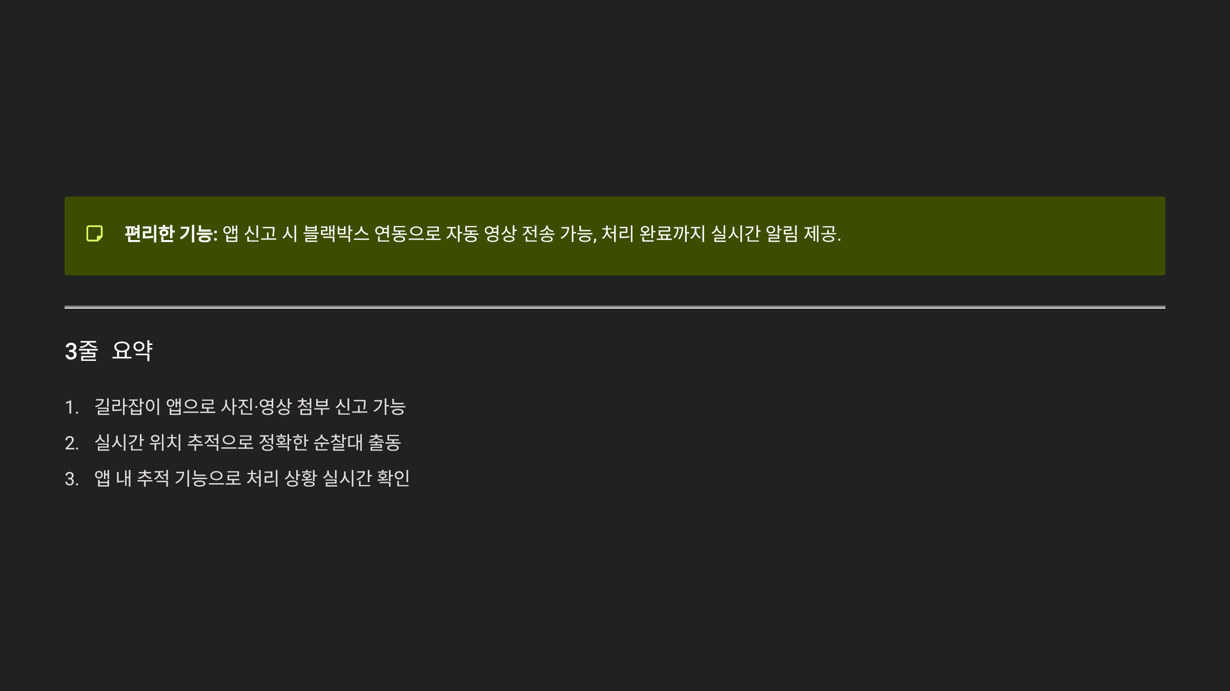 💡 편리한 기능: 앱 신고 시 블랙박스 연동으로 자동 영상 전송 가능, 처리 완료까지 실시간 알림 제공.