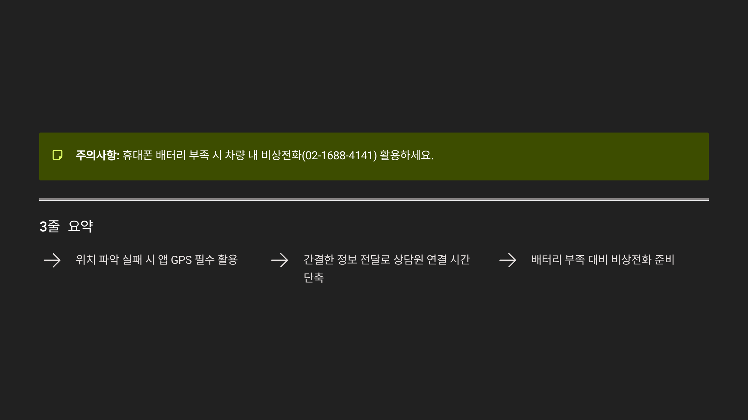 ⚠️ 주의사항: 휴대폰 배터리 부족 시 차량 내 비상전화(02-1688-4141) 활용하세요.