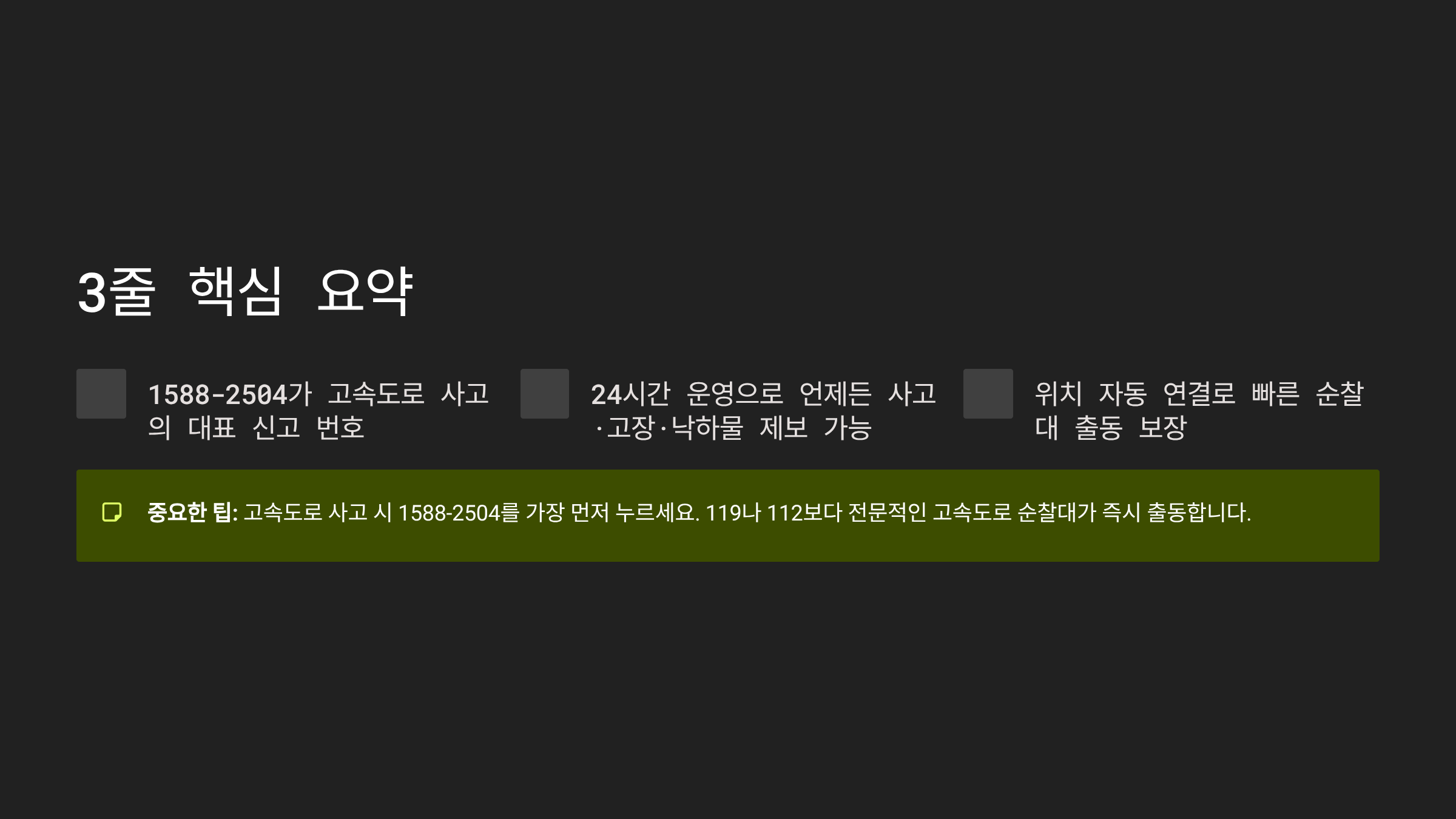 ⚠️ 중요한 팁: 고속도로 사고 시 1588-2504를 가장 먼저 누르세요. 119나 112보다 전문적인 고속도로 순찰대가 즉시 출동합니다.