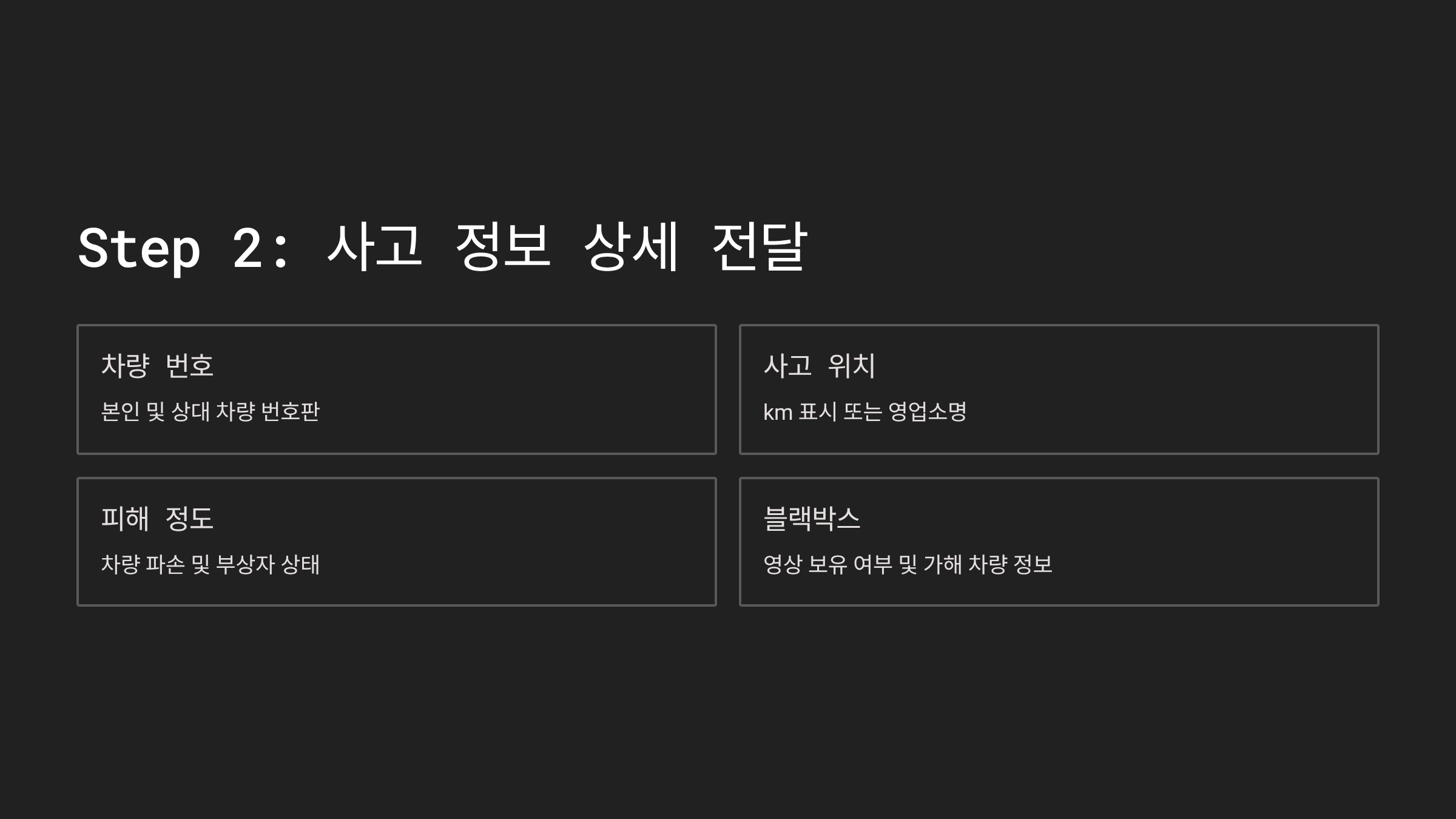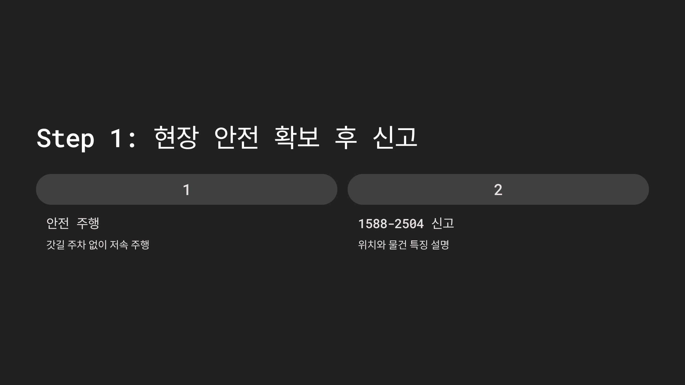 상담원에게 차량 번호, 사고 위치, 피해 정도, 부상자 여부를 전달합니다. 블랙박스 영상이 있다면 낙하물 사고 등 가해 차량 정보도 함께 제보합니다. 상담원이 순찰대 출동 지시를 내립니다.