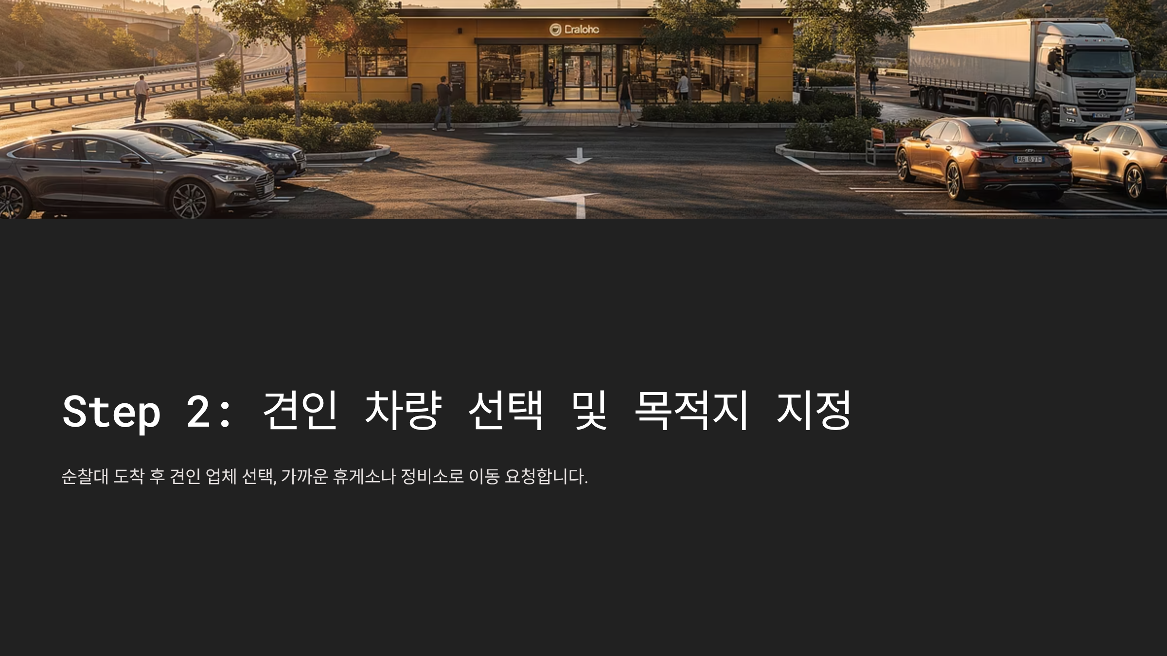 순찰대 도착 후 견인 업체 선택, 가까운 휴게소나 정비소로 이동 요청합니다.