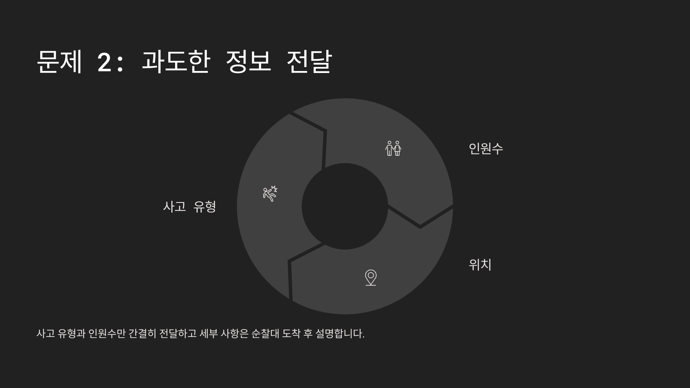 사고 유형과 인원수만 간결히 전달하고 세부 사항은 순찰대 도착 후 설명합니다.