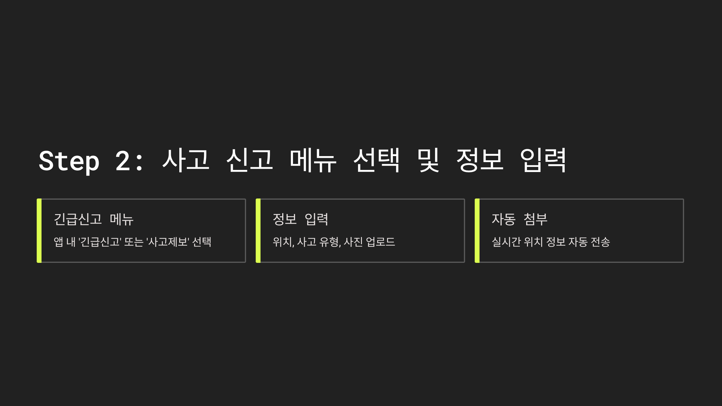 앱 내 '긴급신고' 또는 '사고제보' 메뉴를 선택하고 위치, 사고 유형, 사진을 업로드합니다. 실시간 위치 정보가 자동 첨부됩니다.