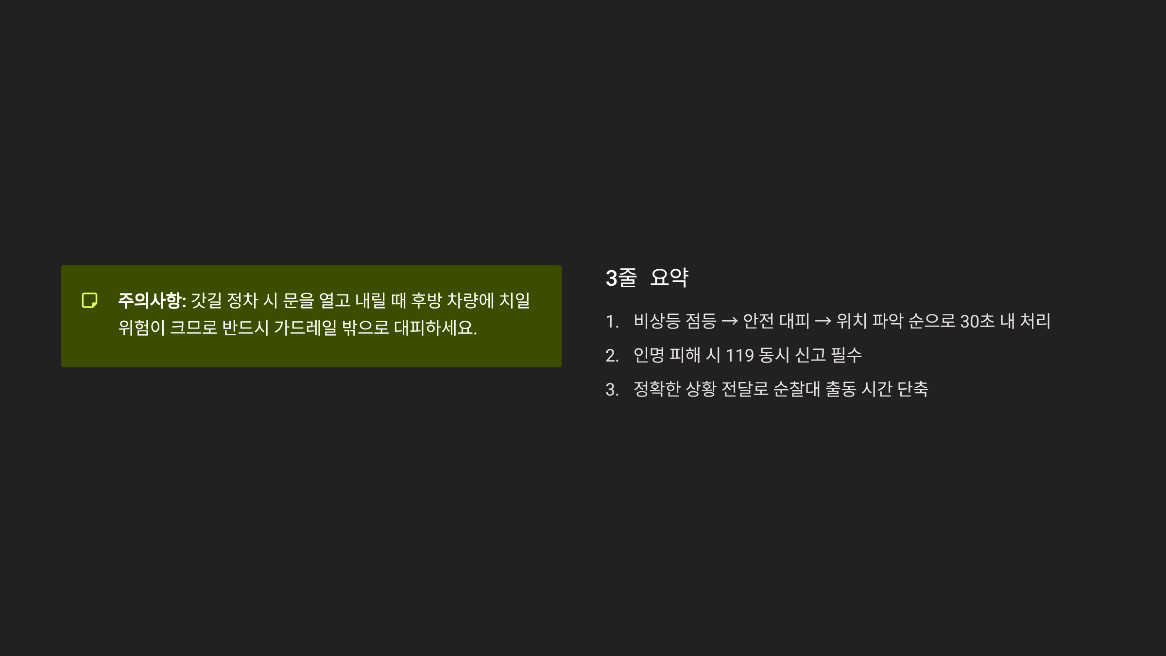 비상등 점등 → 안전 대피 → 위치 파악 순으로 30초 내 처리
