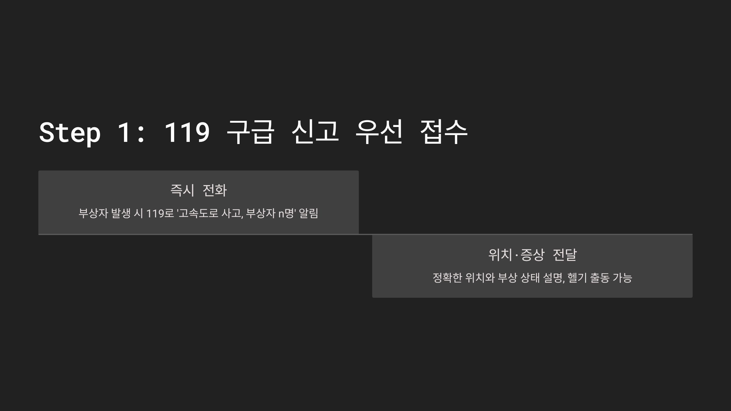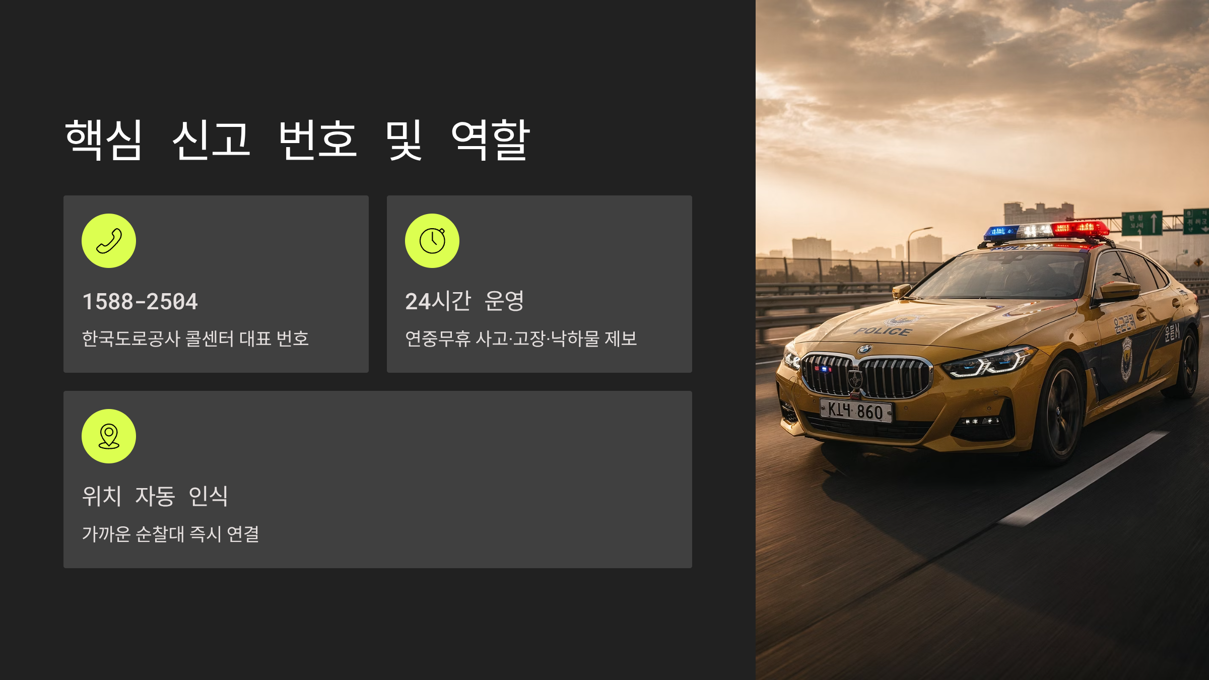 고속도로 사고라도 인명 피해가 있으면 119와 112를 반드시 병행 신고합니다. 한국도로공사 콜센터와 함께 3중 안전망을 구축합니다.