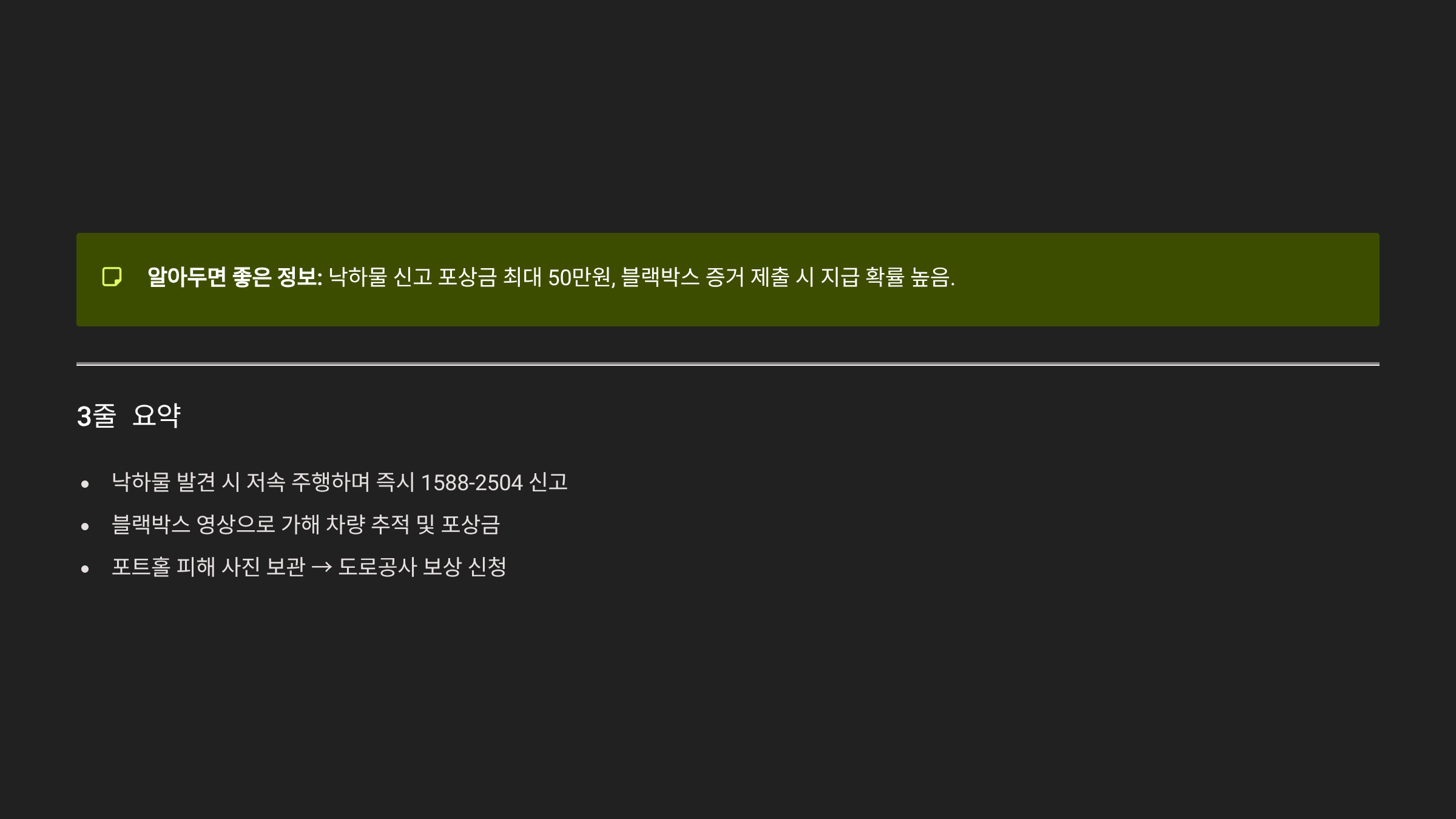 💡 알아두면 좋은 정보: 낙하물 신고 포상금 최대 50만원, 블랙박스 증거 제출 시 지급 확률 높음.