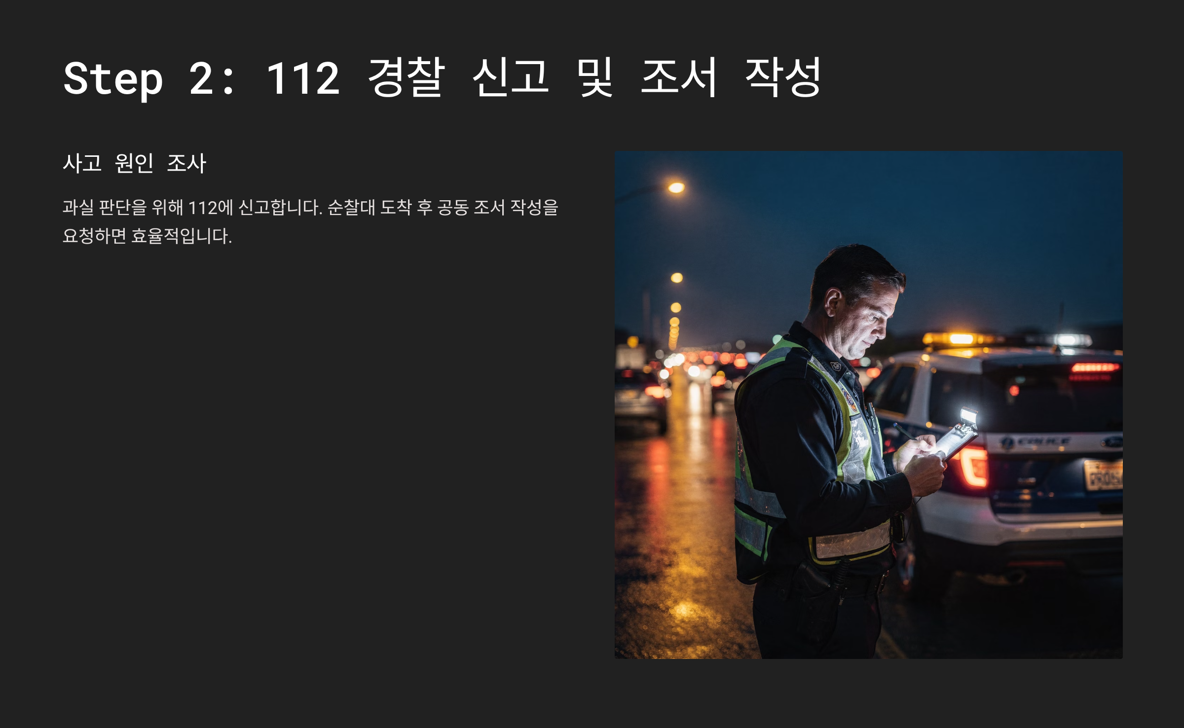 ⚠️ 경고: 경미한 접촉 사고라도 반드시 신고하세요. 미신고 시 나중에 과실 분쟁 발생 가능합니다.