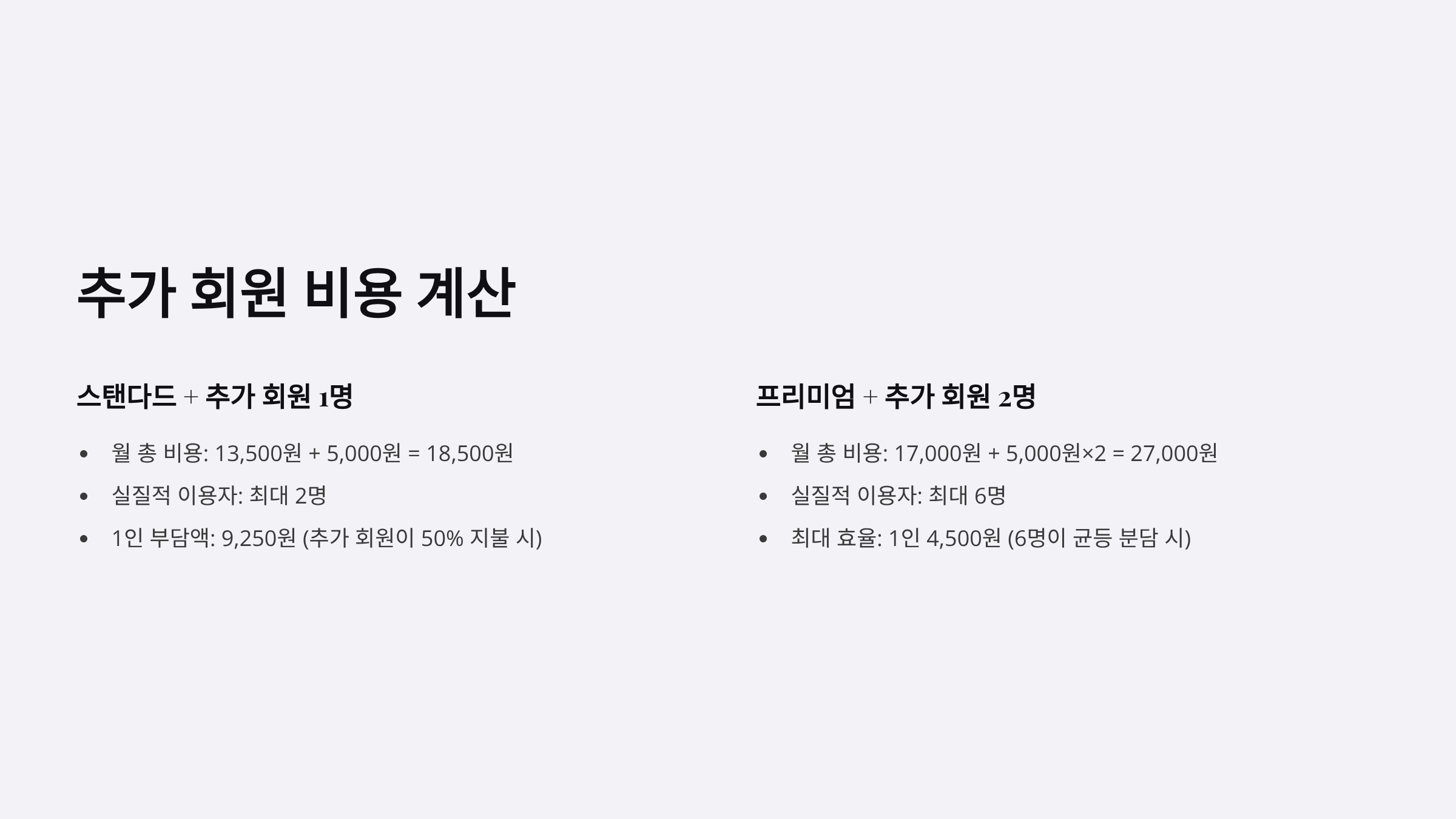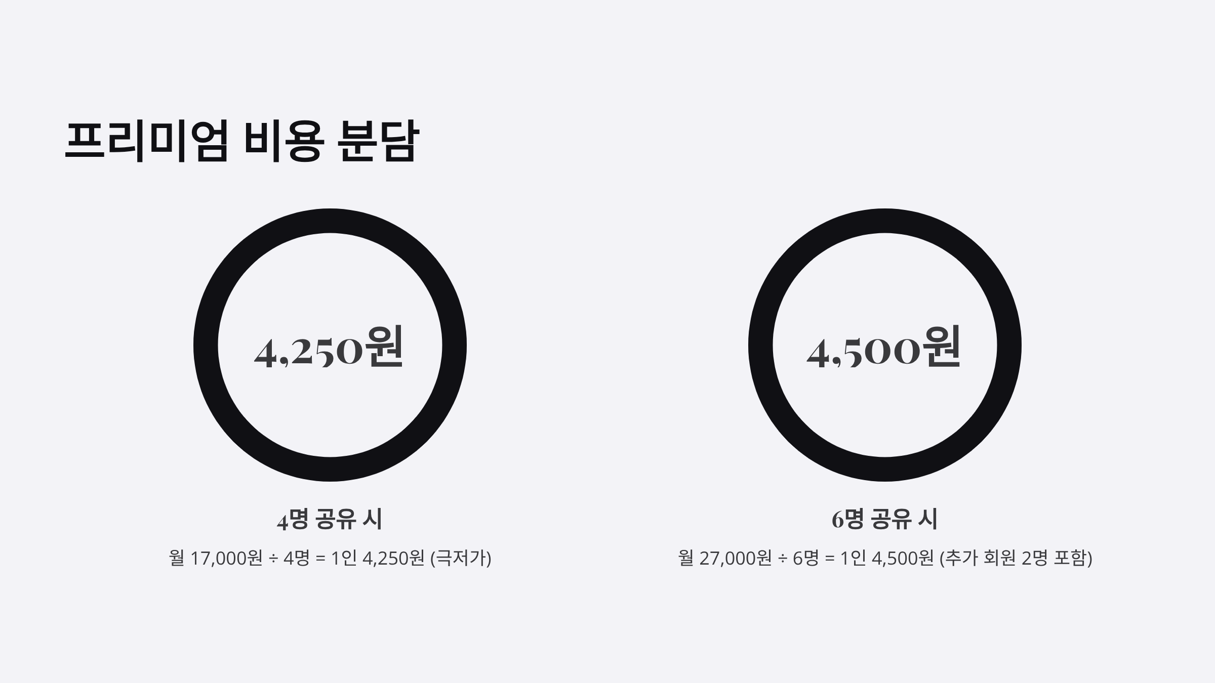 - 6명 공유 시(추가 회원 2명): 월 27,000원(17,000원 + 5,000원×2) ÷ 6명 = 1인 4,500원