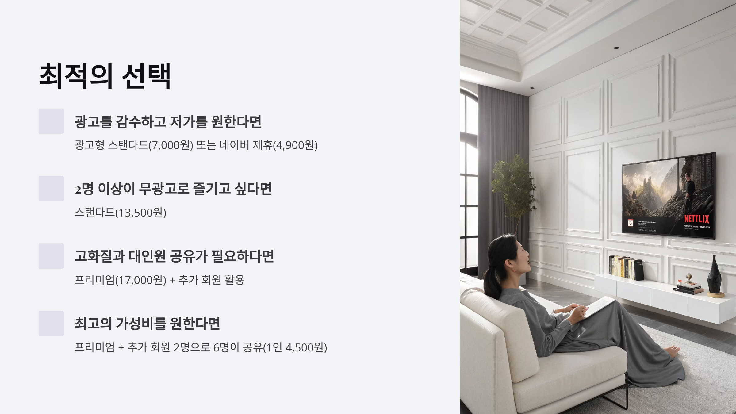 - 비용 우선: 최대한 저렴하게 넷플릭스 이용을 시작하고 싶은 경우