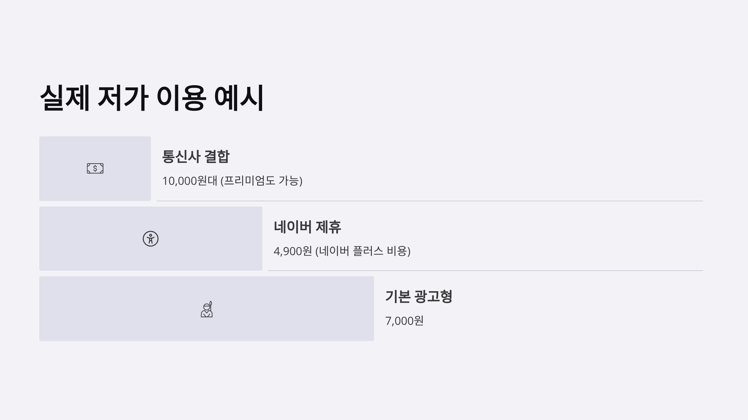 | 비용 극대화 중시 | 제휴 + 광고형 | 네이버·통신사로 월 5,000원대 |