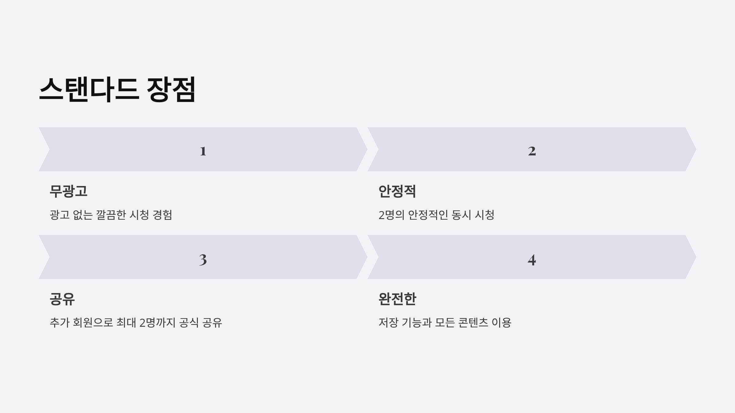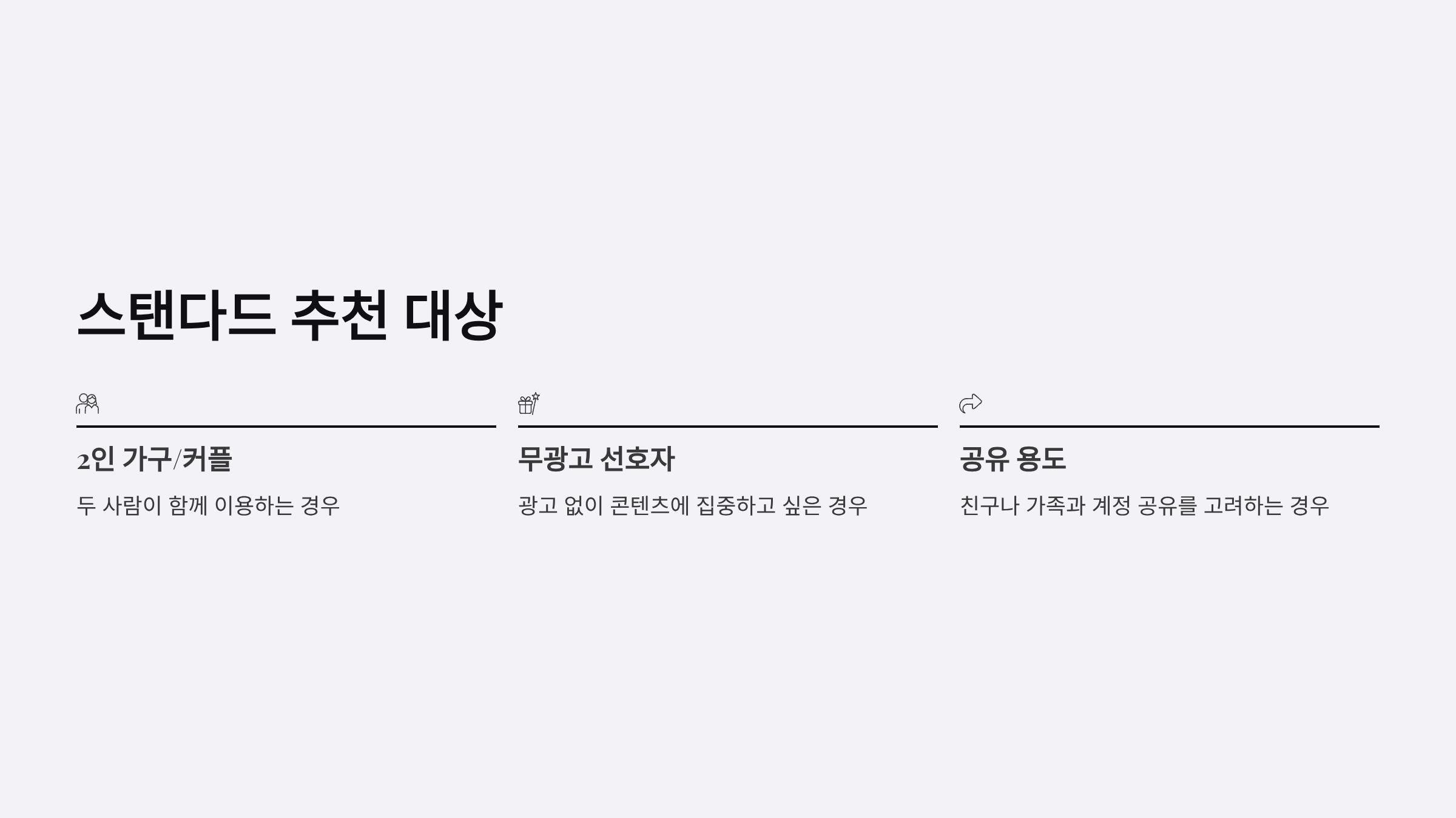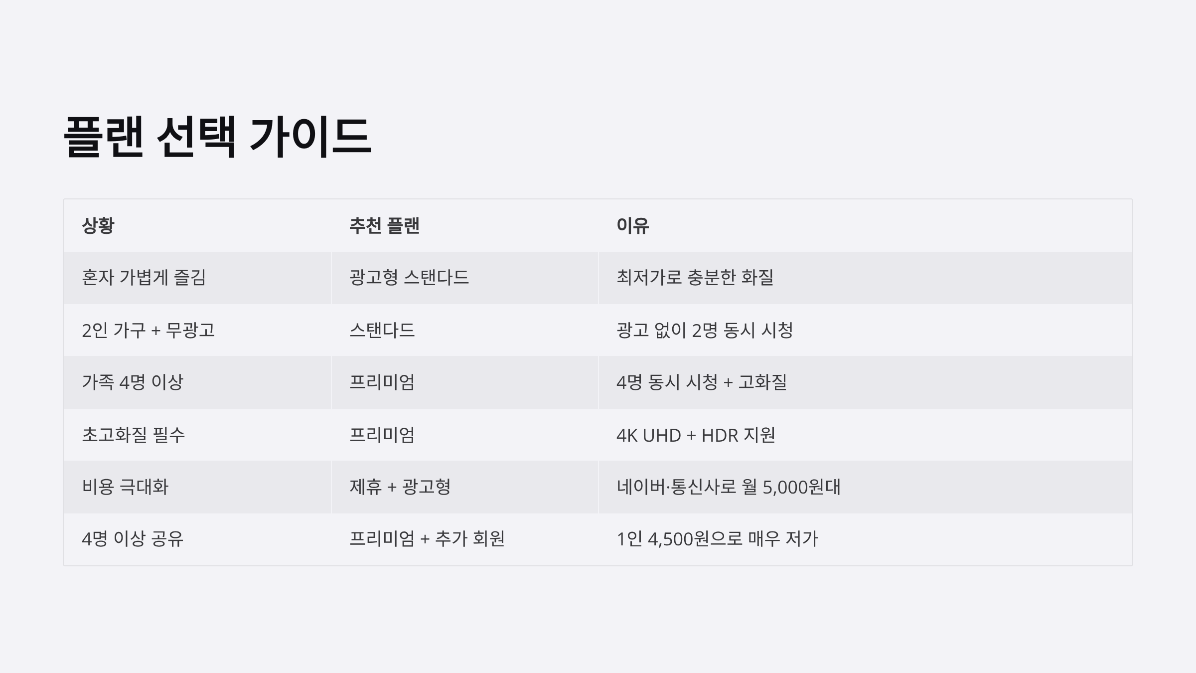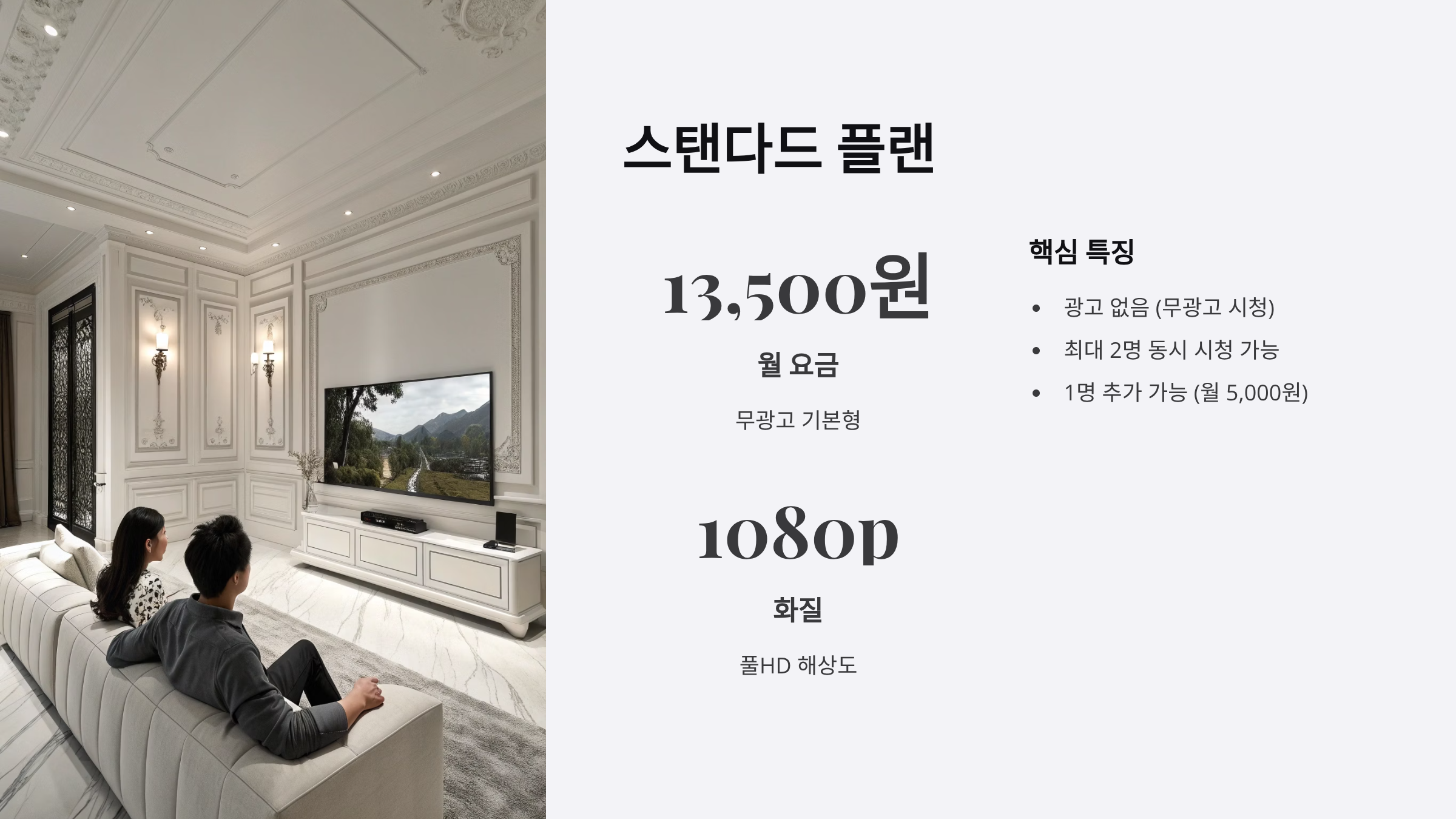 | 2인 가구 + 무광고 선호 | 스탠다드 (13,500원) | 광고 없이 2명 동시 시청 |
