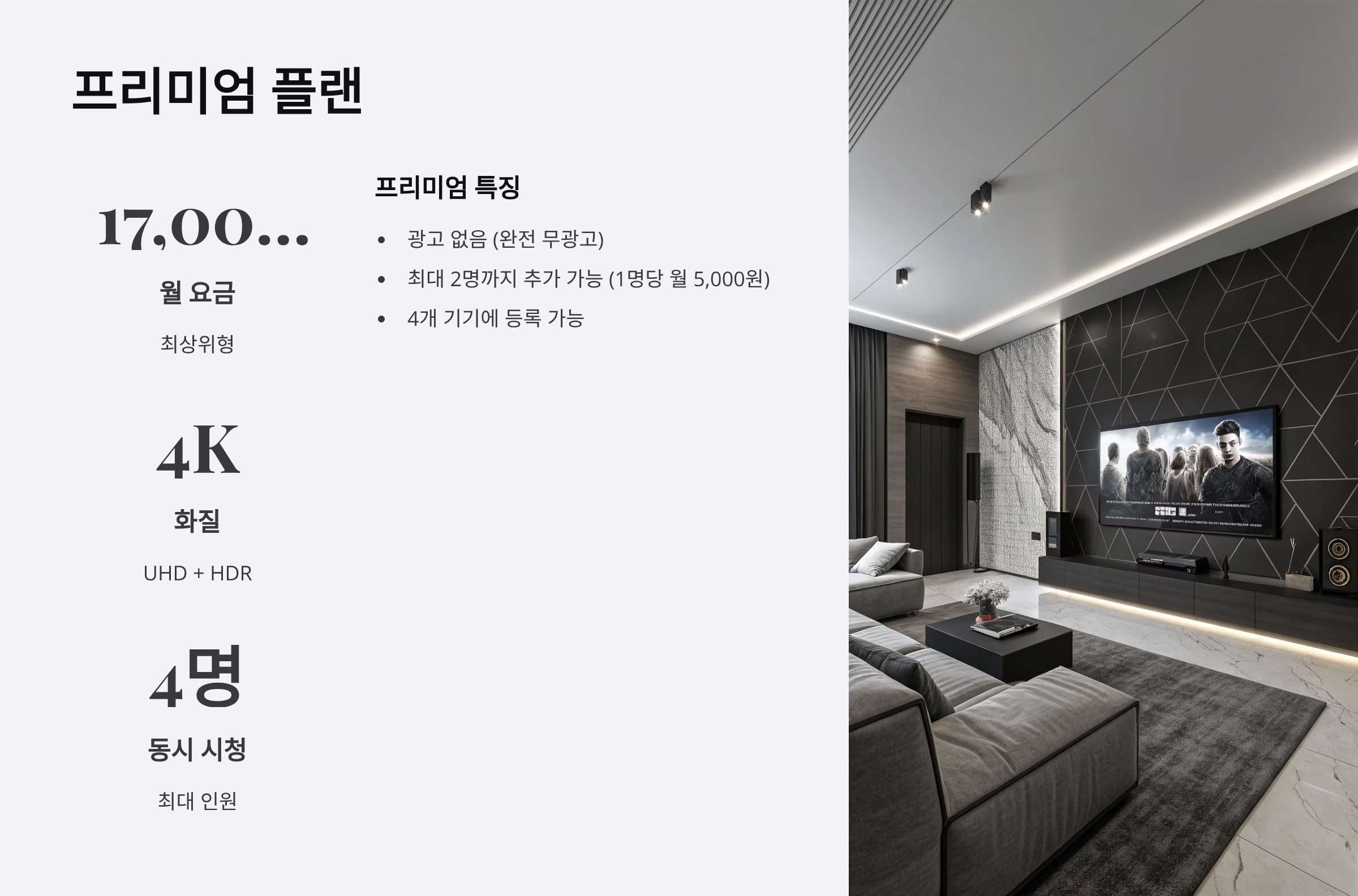 | 초고화질 필수 | 프리미엠 (17,000원) | 4K UHD + HDR 지원 |