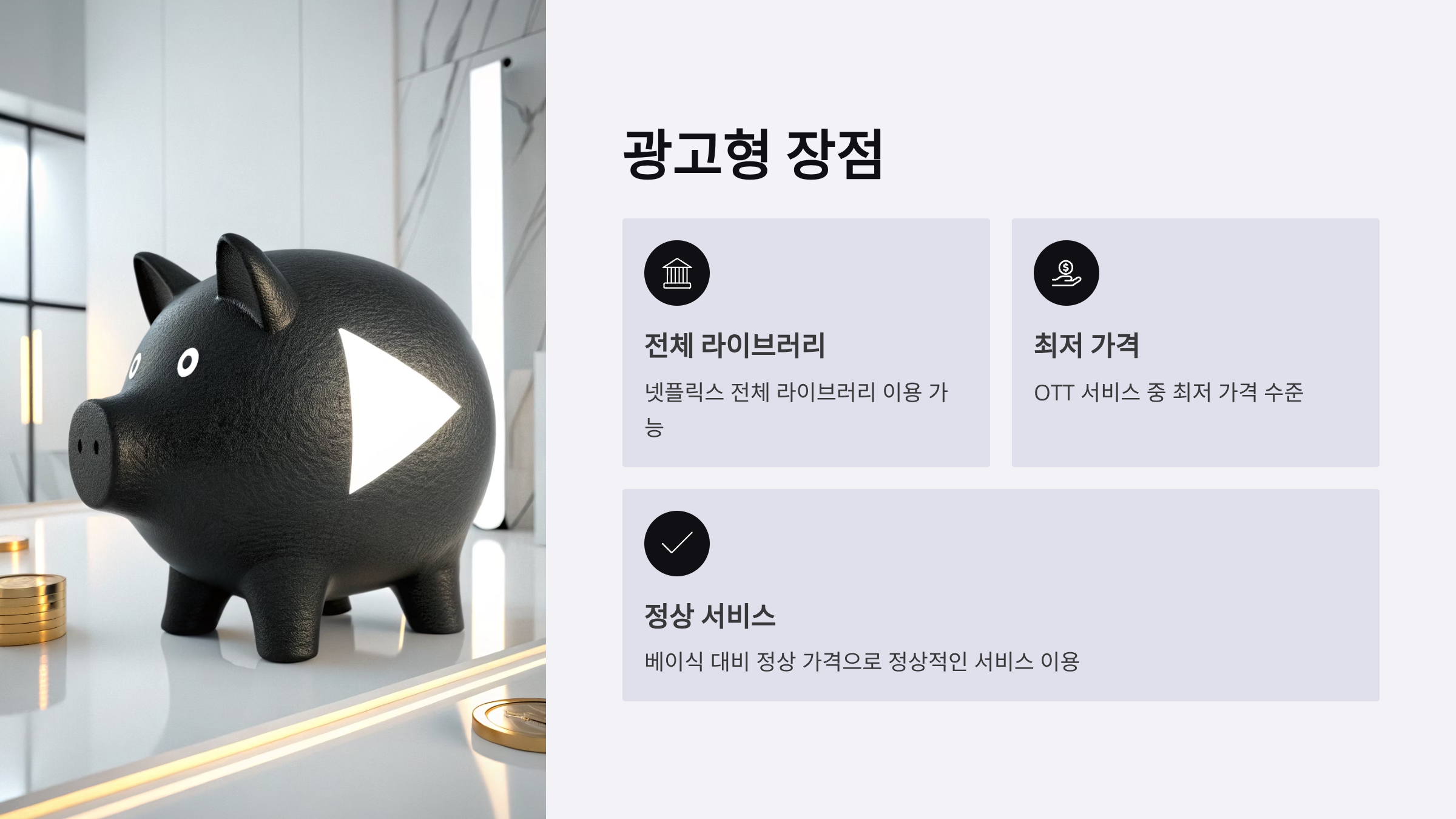 | 혼자 가볍게 즐김 | 광고형 스탠다드 (7,000원) | 최저가로 충분한 화질 |