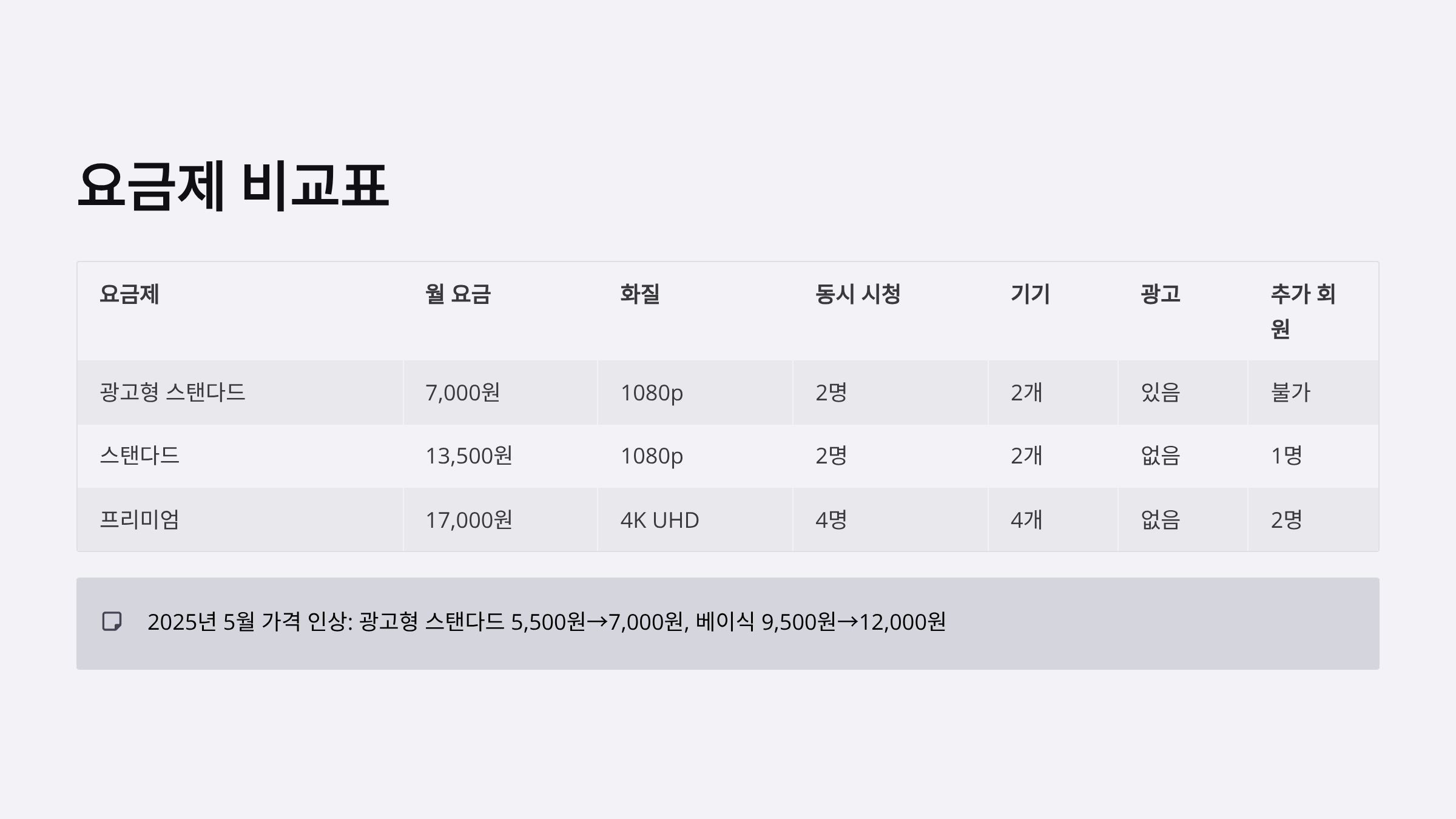 2025년 5월 가격 인상 이력: 광고형 스탠다드는 기존 5,500원에서 7,000원으로, 베이식은 9,500원에서 12,000원으로 인상되었습니다. 현재 스탠다드와 프리미엄은 가격 유지 상태입니다.