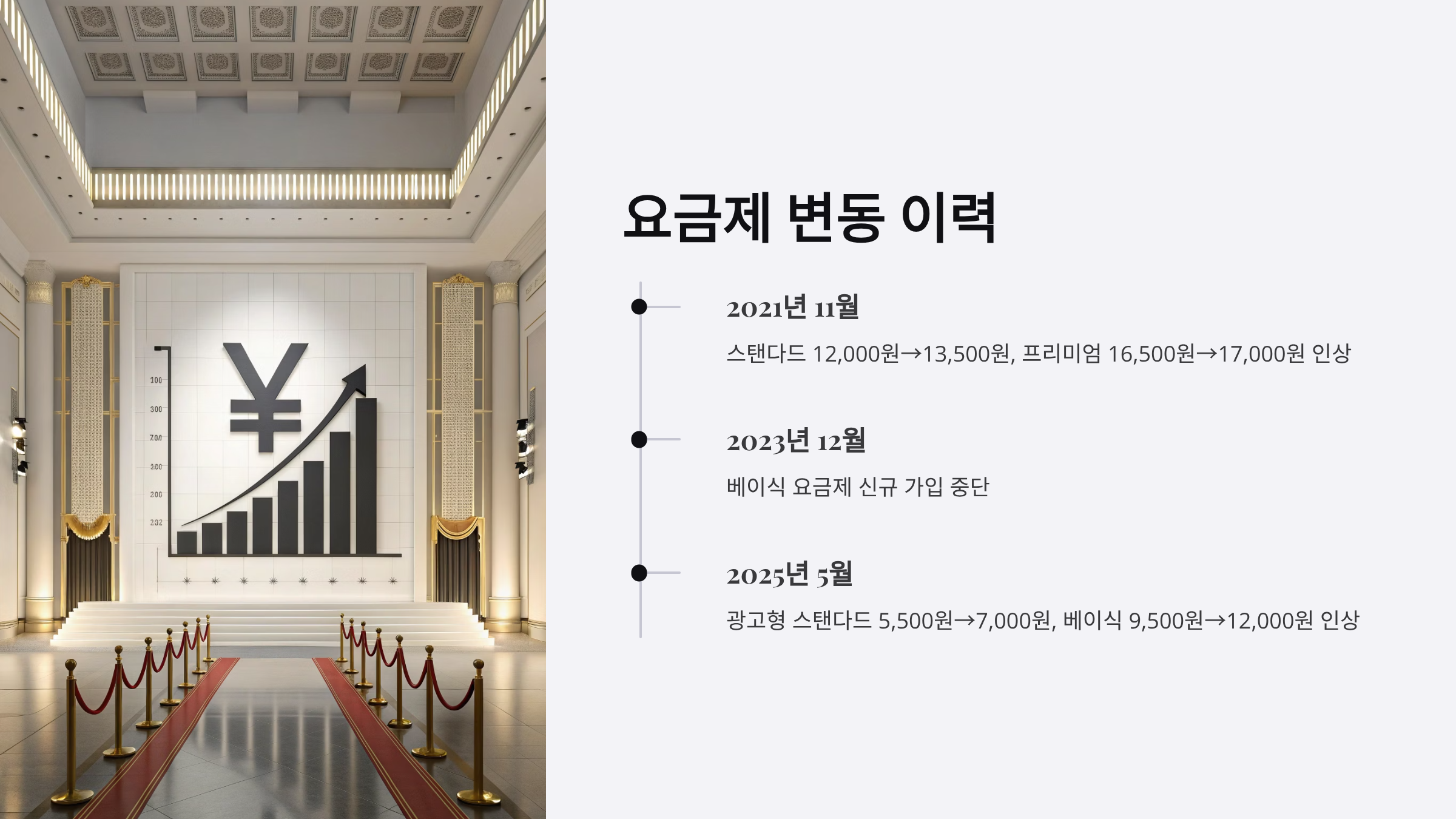 - 2025년 5월: 광고형 스탠다드 5,500원 → 7,000원, 베이식 9,500원 → 12,000원으로 인상