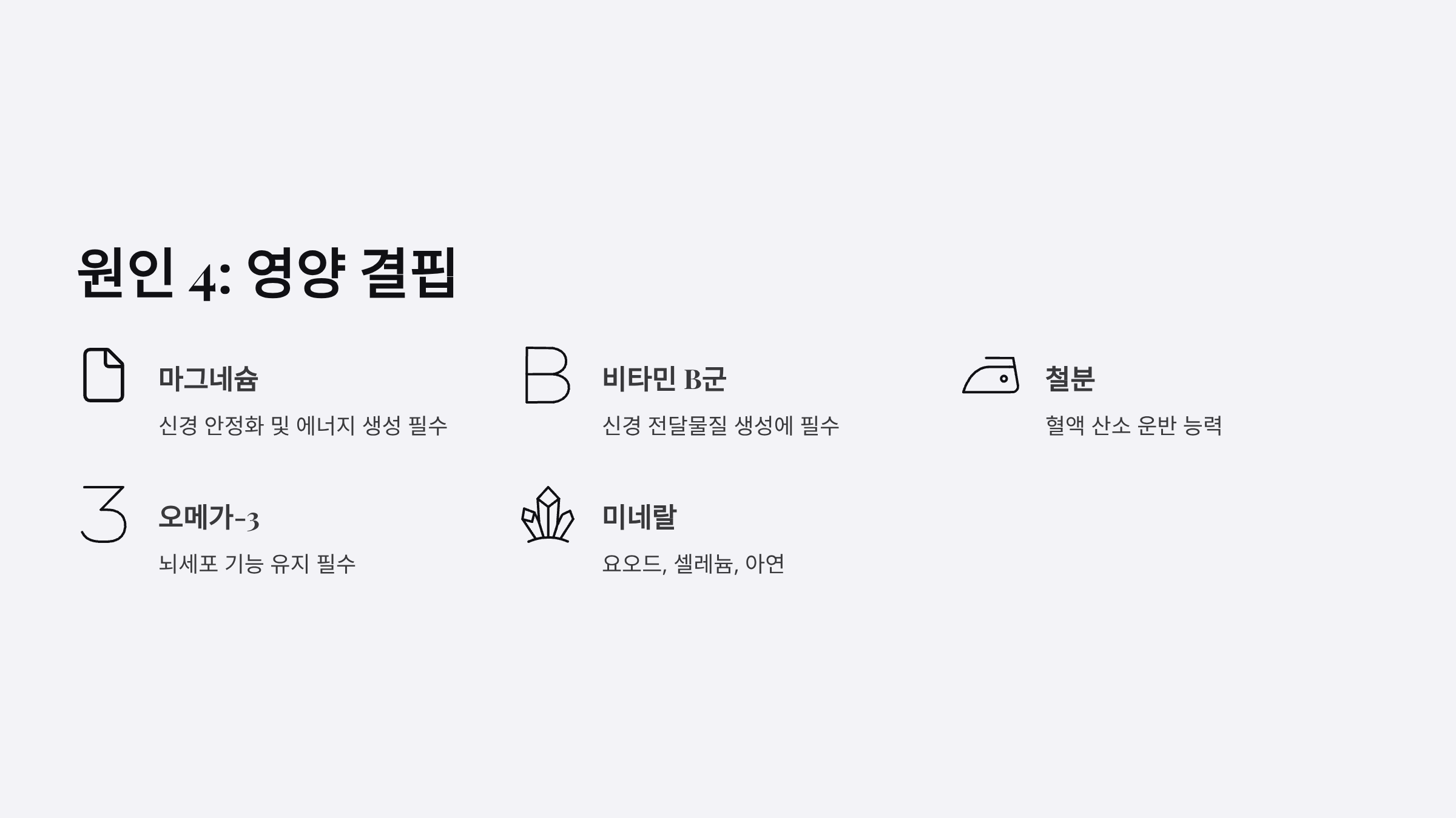 뇌 기능을 유지하는 데 필수적인 미네랄과 비타민 부족이 직접적인 원인이 됩니다.