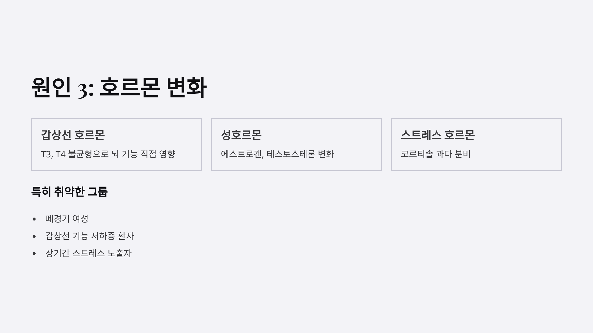 갑상선 호르몬(T3, T4), 에스트로겐, 테스토스테론, 코르티솔 등의 불균형은 직접 뇌 기능에 영향을 미칩니다.