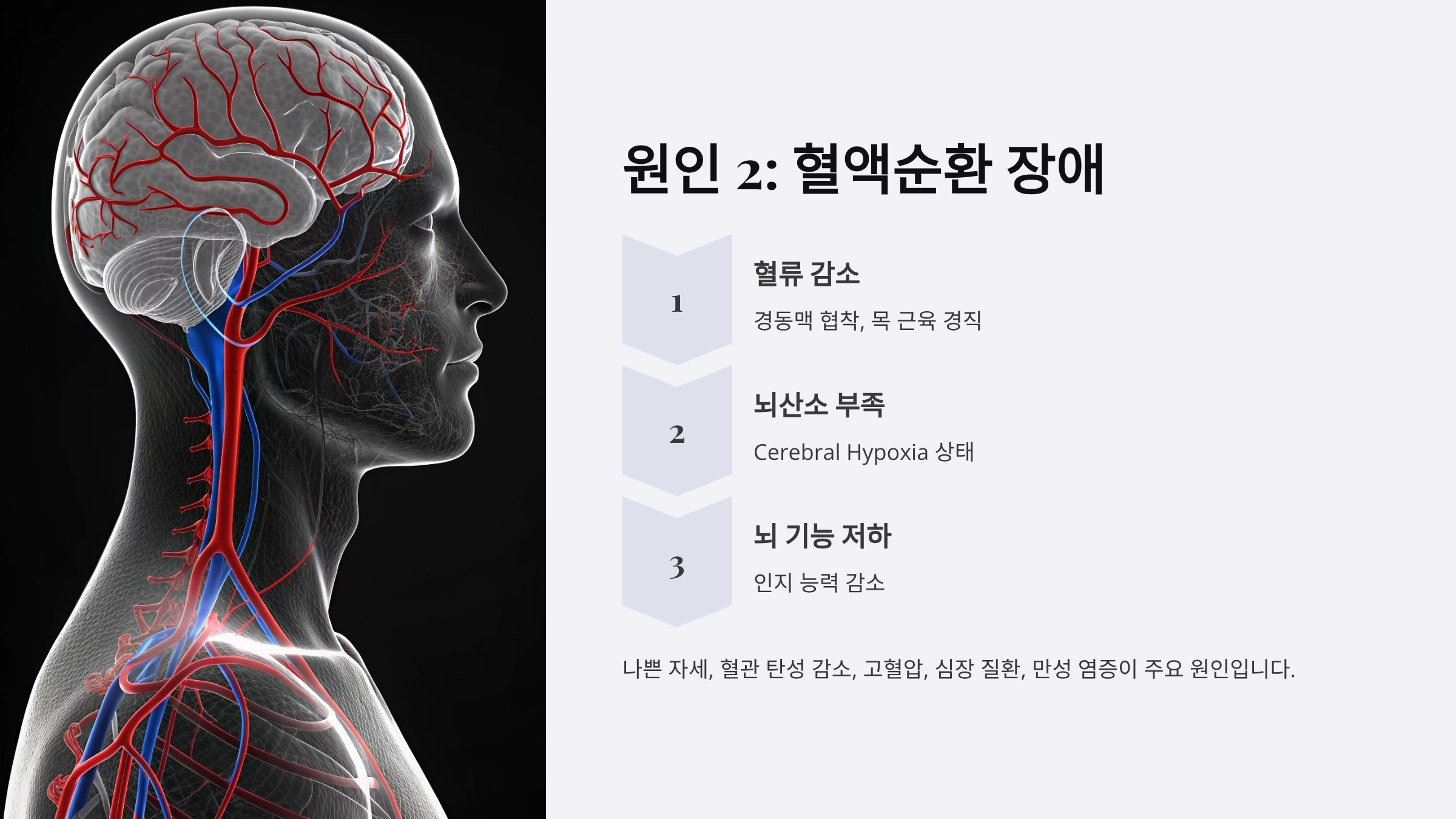 뇌에 공급되는 혈류가 제대로 흐르지 않으면 뇌산소부족(Cerebral Hypoxia) 상태가 됩니다. 경동맥이 좁아지거나 목 주변의 근육이 경직되면 뇌로 가는 혈액의 양이 줄어들면서 뇌 기능이 떨어집니다.