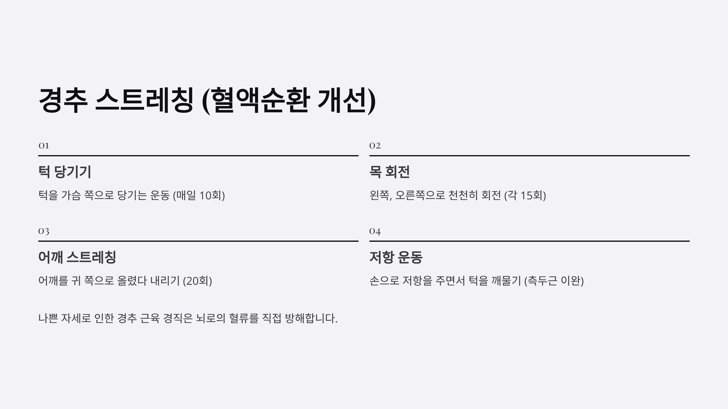 - 목 회전: 왼쪽, 오른쪽으로 천천히 회전 (각 15회)