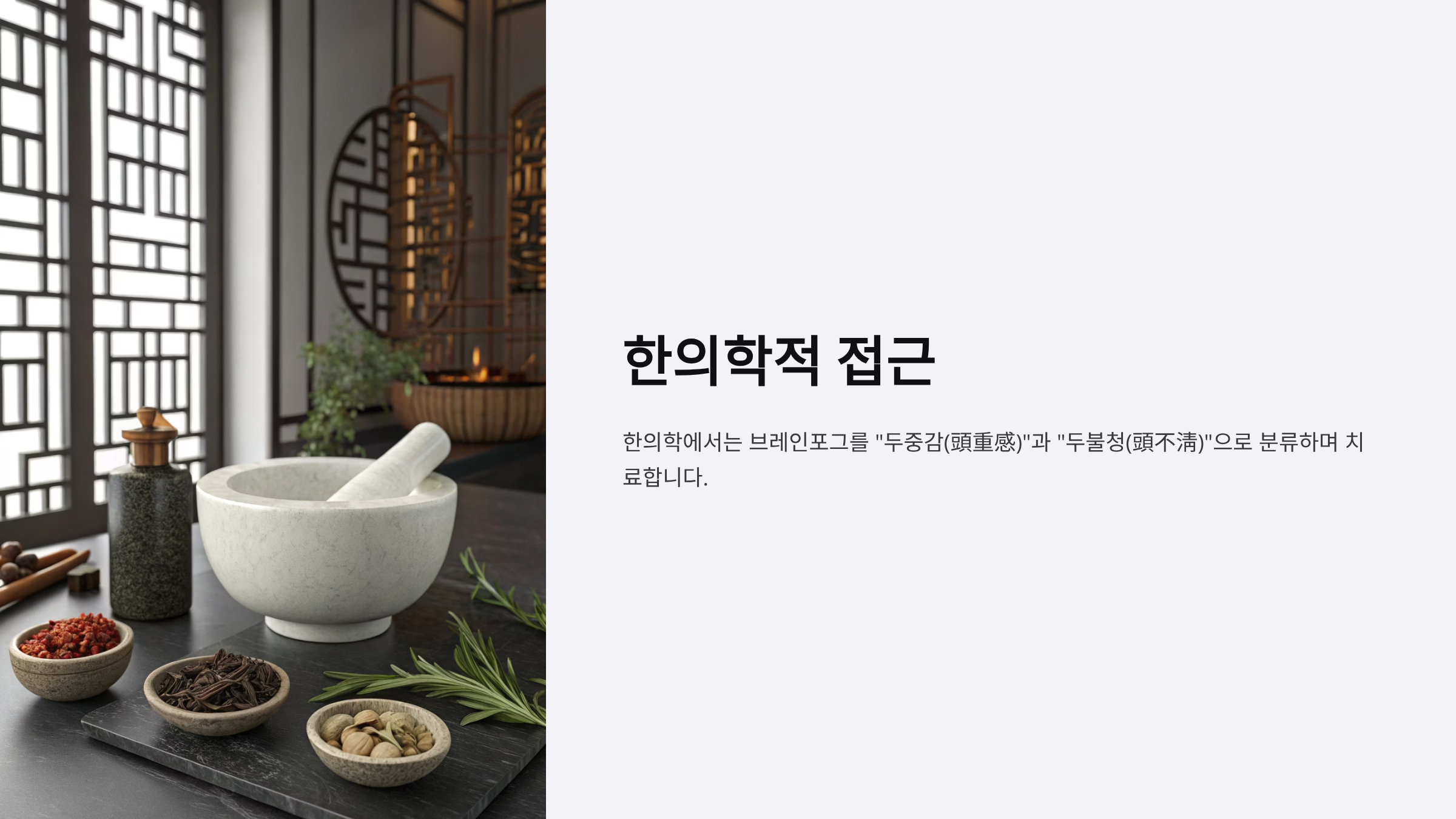 한의학에서는 브레인포그를 "두중감(頭重感)"과 "두불청(頭不淸)"으로 분류하며, 다음과 같이 치료합니다.