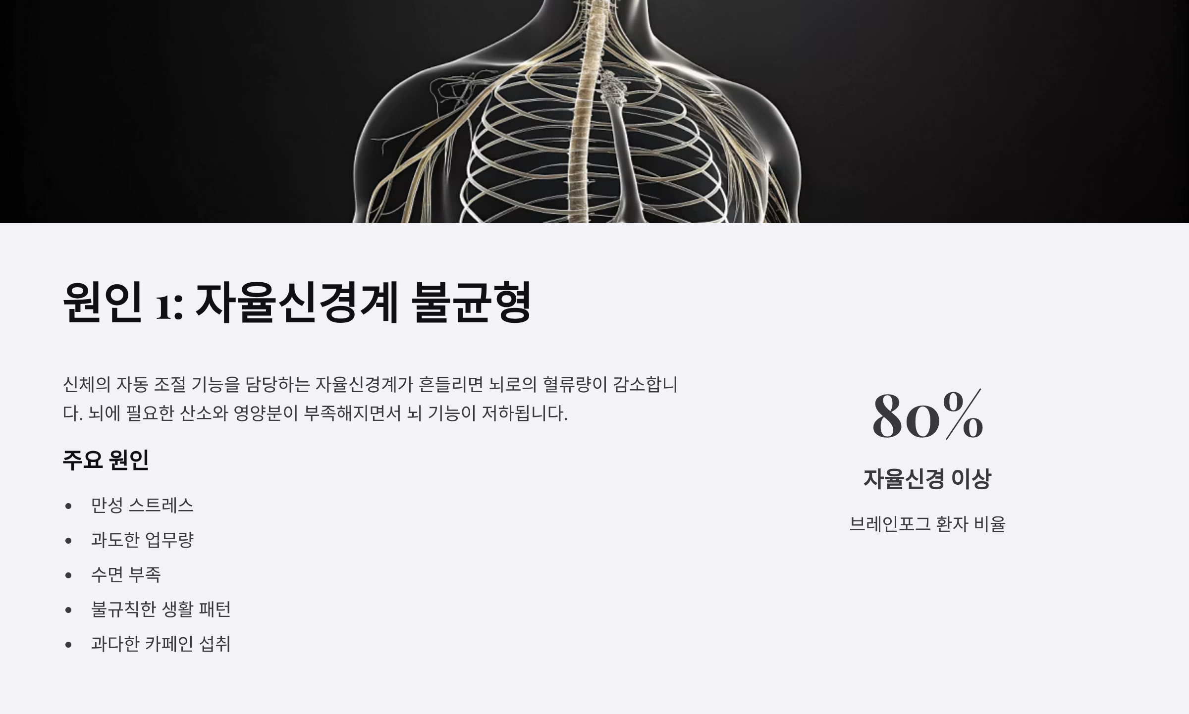 신체의 자동 조절 기능을 담당하는 자율신경계가 흔들리면 뇌로의 혈류량이 감소합니다. 이로 인해 뇌에 필요한 산소와 영양분이 부족해지면서 뇌 기능이 저하됩니다. 신경과 의사들은 브레인포그 환자의 80% 이상이 자율신경 이상을 가지고 있다고 보고합니다.