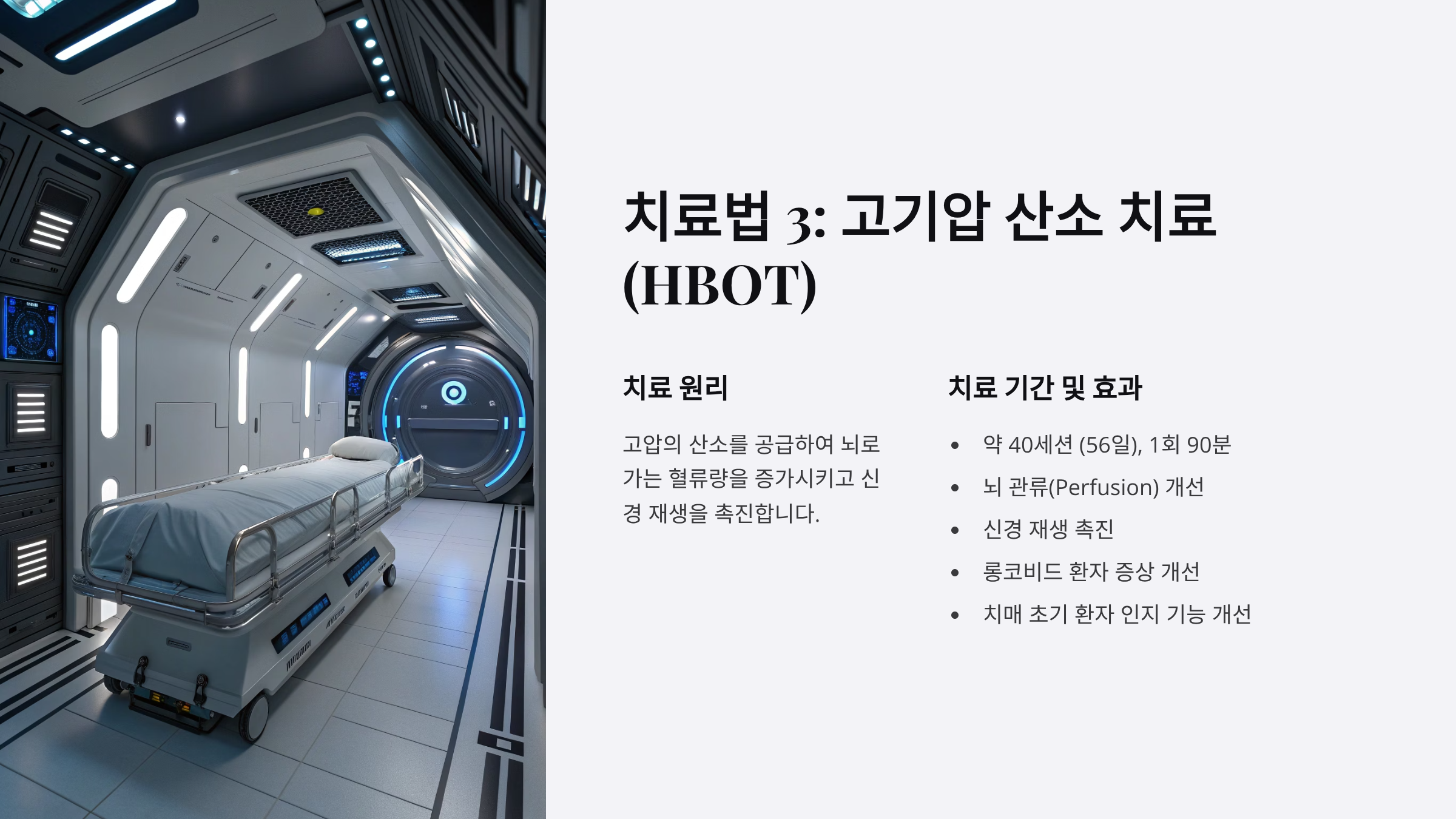 치료 원리: 고압의 산소를 공급하여 뇌로 가는 혈류량을 증가시키고 신경 재생을 촉진합니다.