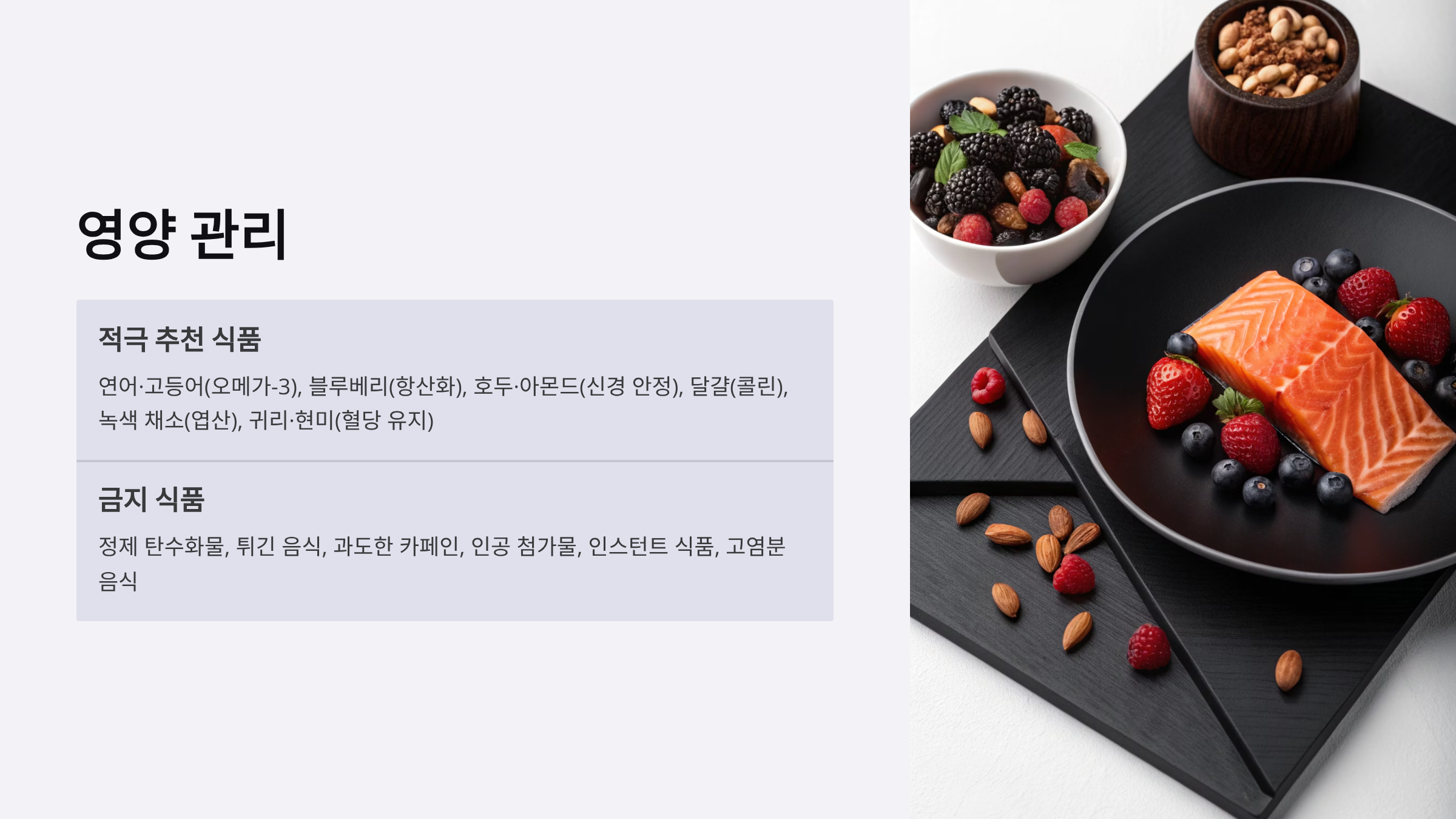 - 연어, 고등어: 오메가-3 풍부 → 뇌세포 기능 유지