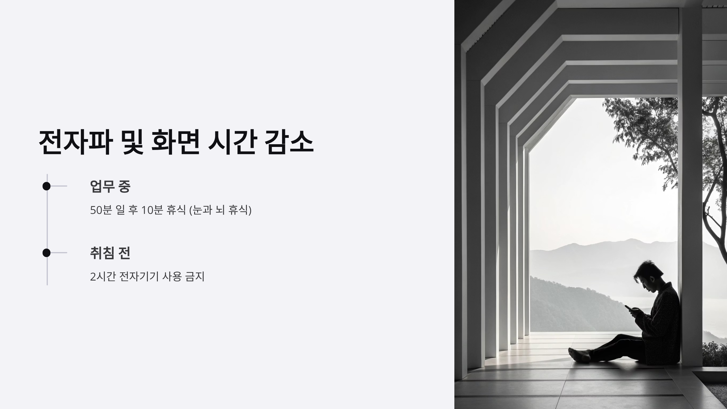 - 매일 같은 시간에 취침하고 기상하기 (수면 리듬 고정)