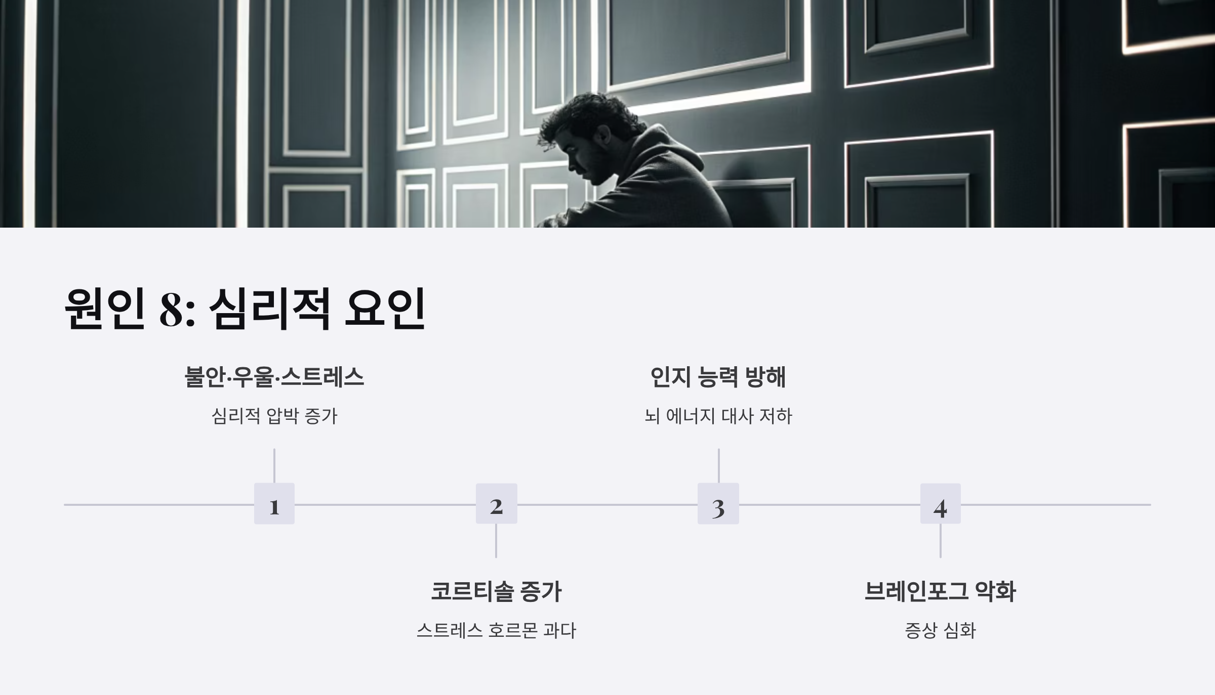 불안증, 우울증, 극심한 스트레스는 뇌의 코르티솔(스트레스 호르몬) 수치를 높여 인지 능력을 직접 방해합니다. 심리 상태가 나쁘면 뇌의 에너지 대사가 저하되어 브레인포그가 악화됩니다.