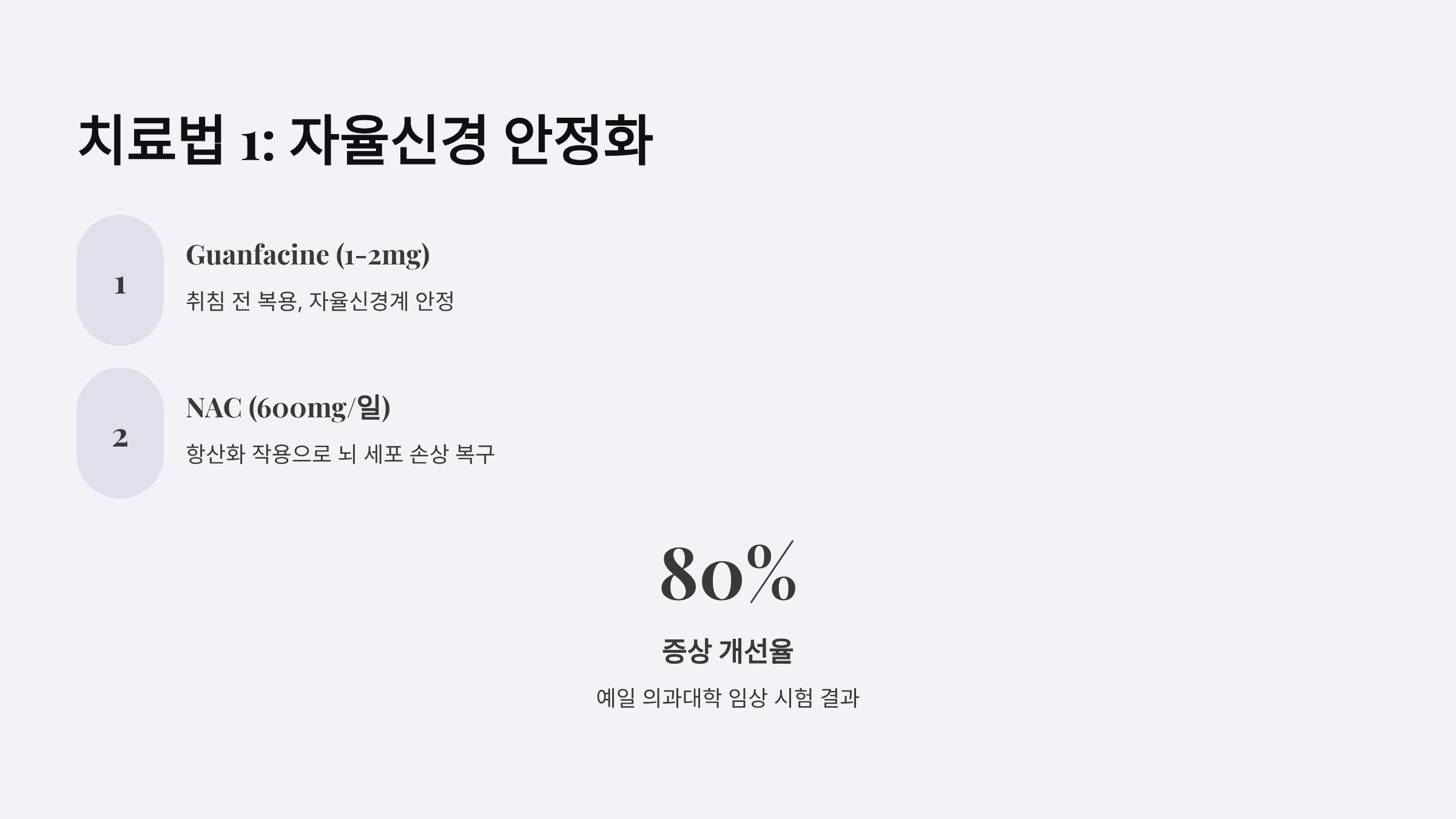 - Guanfacine (1-2mg, 취침 전): 자율신경계를 안정시키는 약물