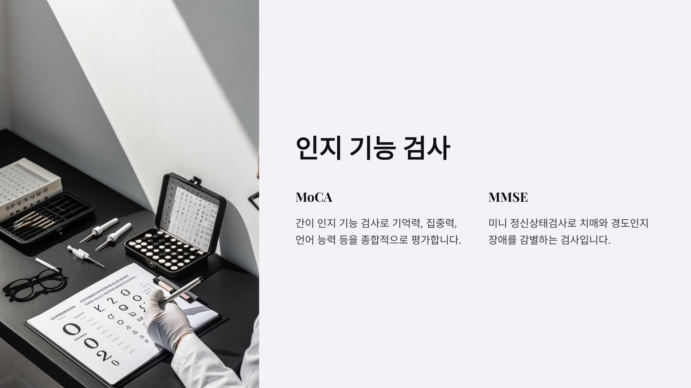 간이 인지 기능 검사(MoCA): 기억력, 집중력, 언어 능력 등을 종합적으로 평가합니다.