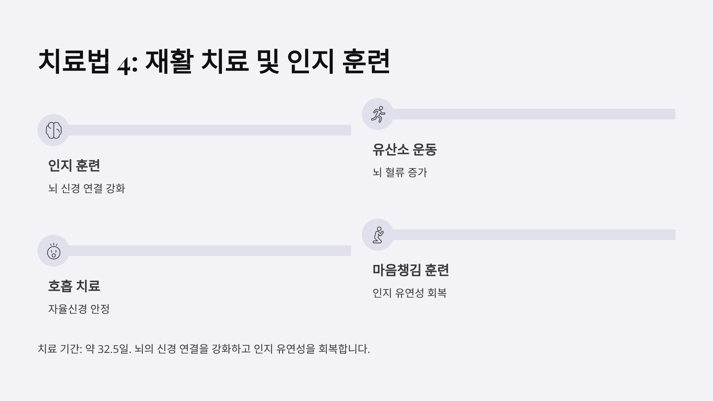 - 구성: 인지 훈련, 유산소 운동, 호흡 치료, 마음챙김 훈련