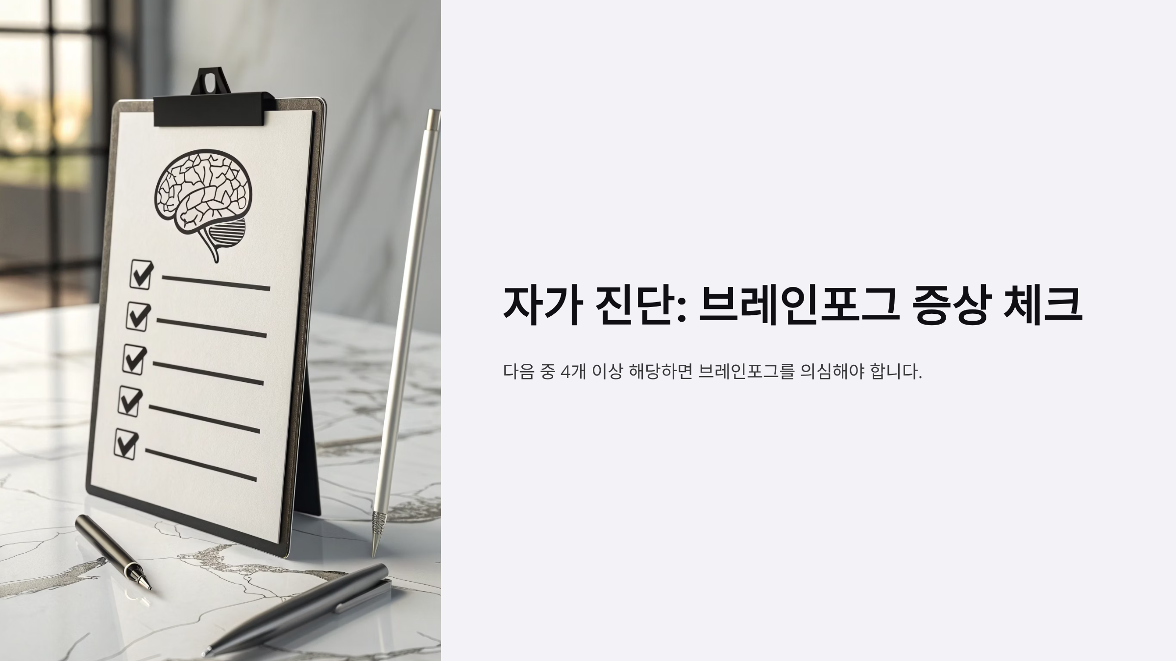 브레인포그를 진단하기 위한 자가 진단 증상들입니다. 다음 중 4개 이상에 해당하면 브레인포그를 의심해야 합니다.