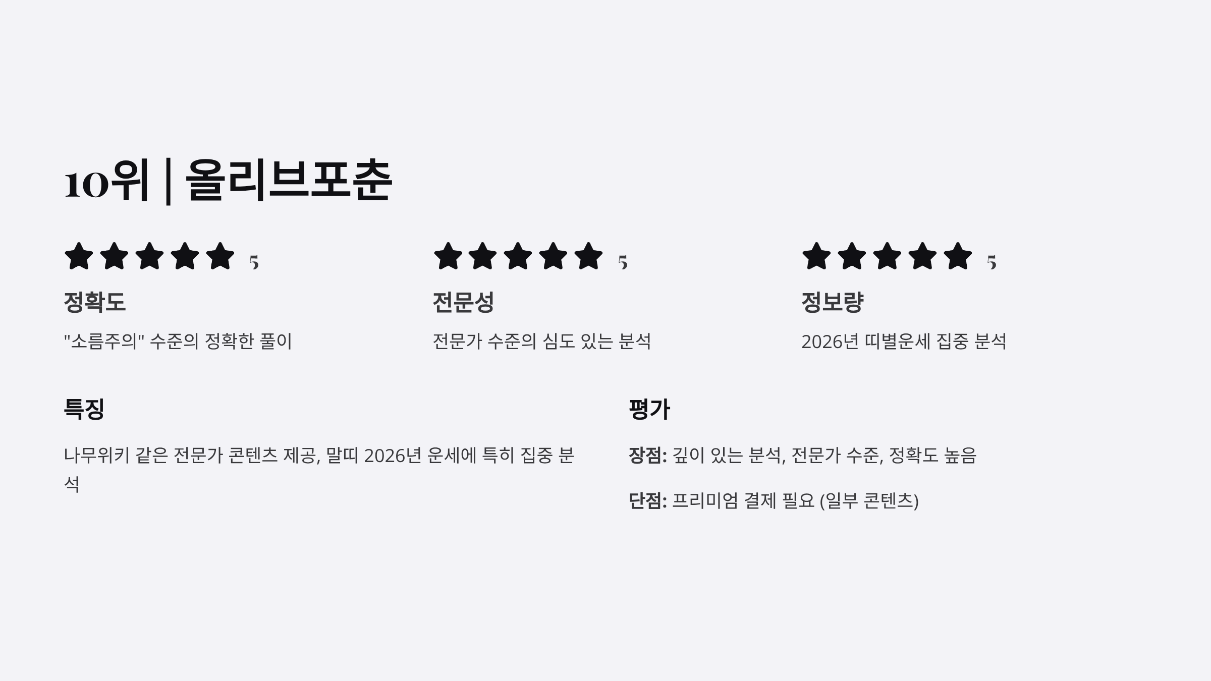 | 올리브포춘 | ⭐⭐⭐⭐⭐ | ⭐⭐⭐⭐⭐ | ⭐⭐⭐ | ⭐⭐⭐⭐⭐ | 심도 있는 분석, 정확도 최고 |