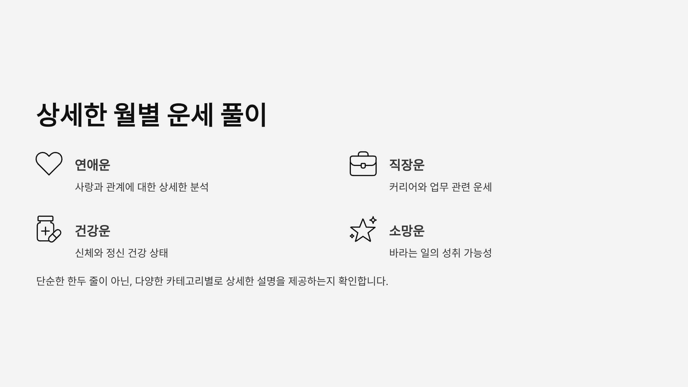 단순한 한두 줄의 운세가 아니라, 연애운, 직장운, 건강운, 소망운 등 다양한 카테고리별로 상세한 설명을 제공하는지 확인합니다.