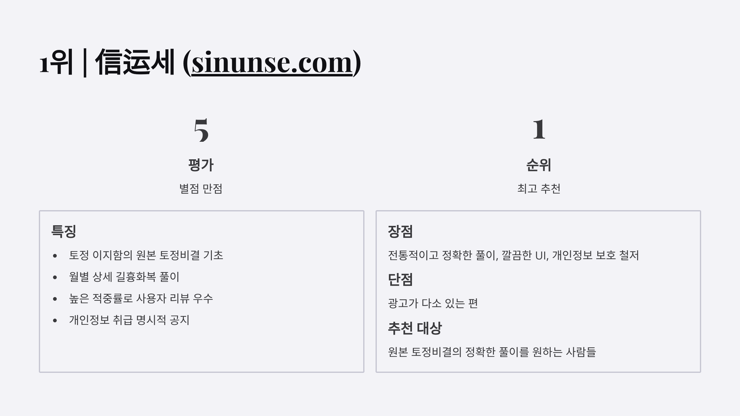 | 信运세 | ⭐⭐⭐⭐⭐ | ⭐⭐⭐⭐⭐ | ⭐⭐⭐⭐ | ⭐⭐⭐⭐⭐ | 원본 토정비결, 정확한 풀이 |