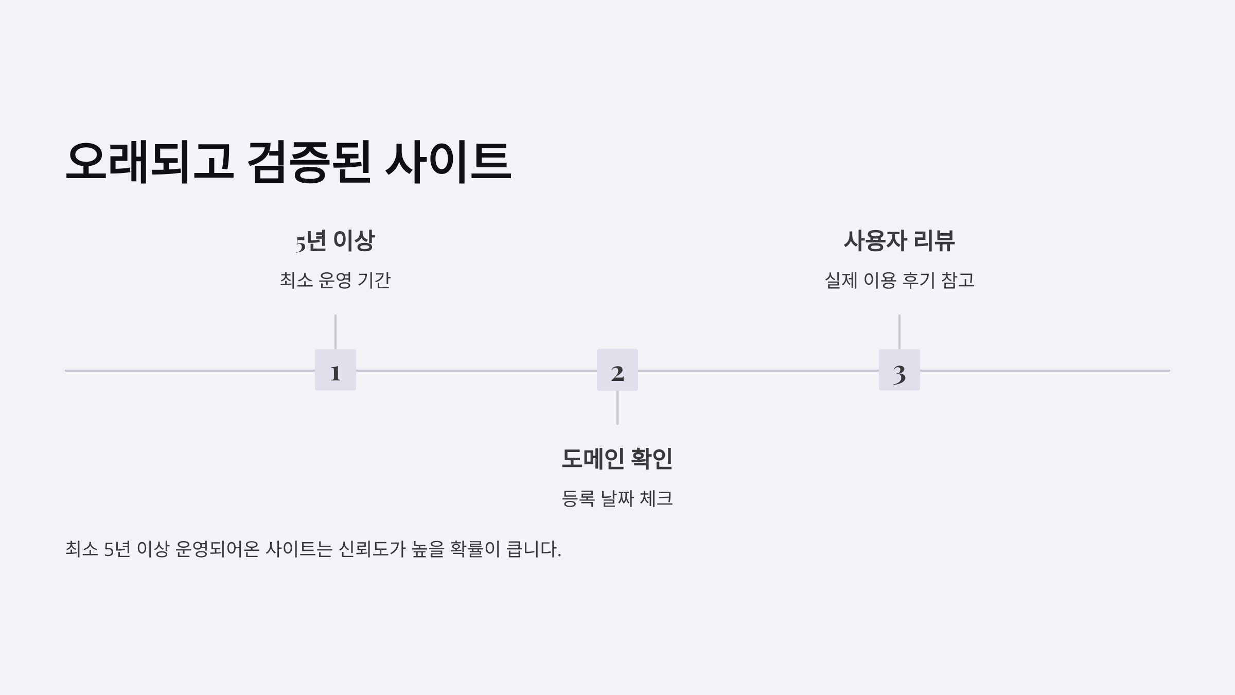최소 5년 이상 운영되어온 사이트는 신뢰도가 높을 확률이 큽니다. 도메인 나이, 사용자 리뷰 등을 참고합니다.