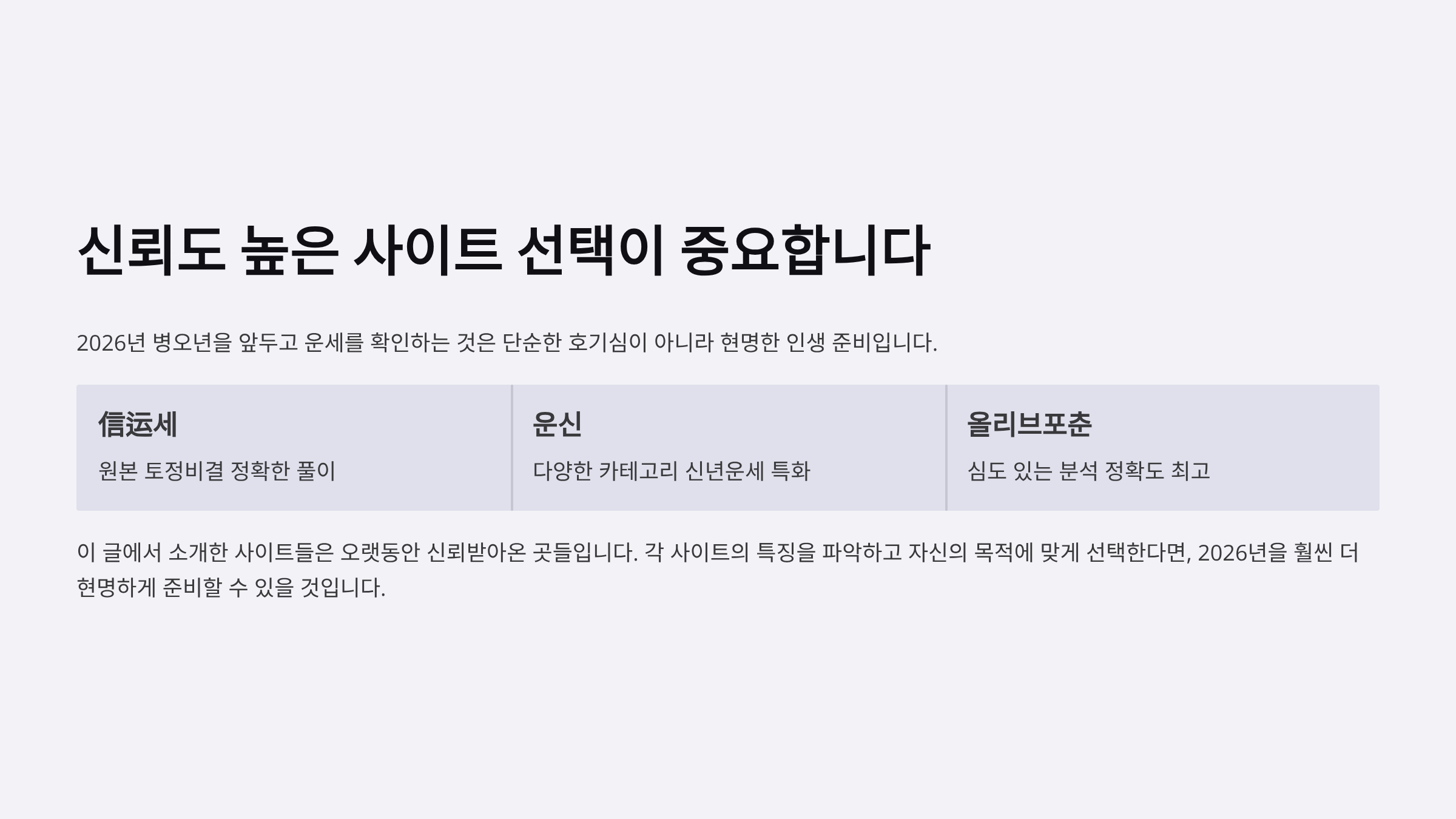 이 글에서 소개한 信运세, 운신, 올리브포춘 등의 사이트들은 오랫동안 신뢰받아온 곳들입니다. 각 사이트의 특징을 파악하고 자신의 목적에 맞게 선택한다면, 2026년을 훨씬 더 현명하게 준비할 수 있을 것입니다.