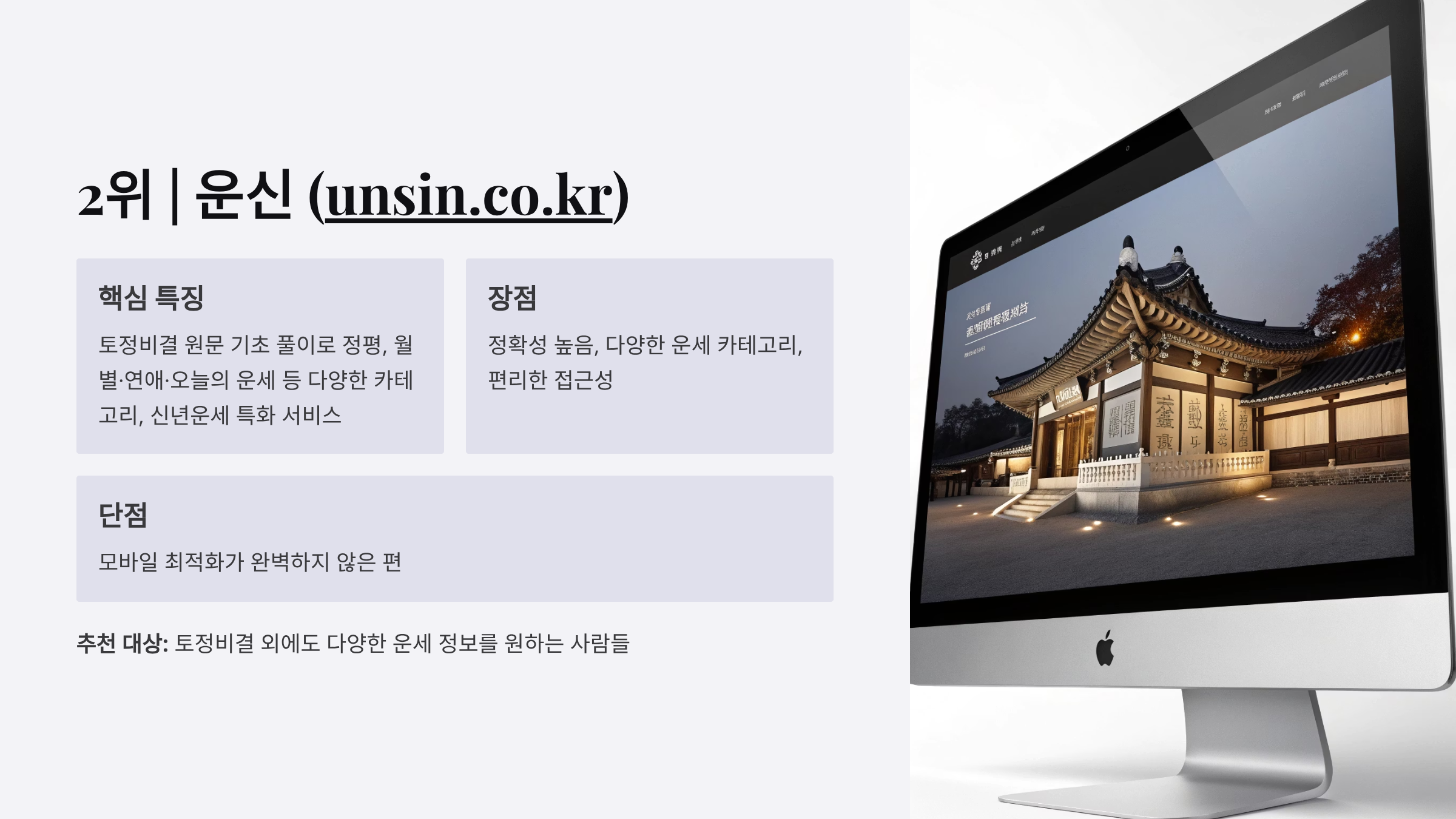 | 운신 | ⭐⭐⭐⭐⭐ | ⭐⭐⭐⭐⭐ | ⭐⭐⭐⭐ | ⭐⭐⭐⭐⭐ | 다양한 카테고리, 신년운세 특화 |