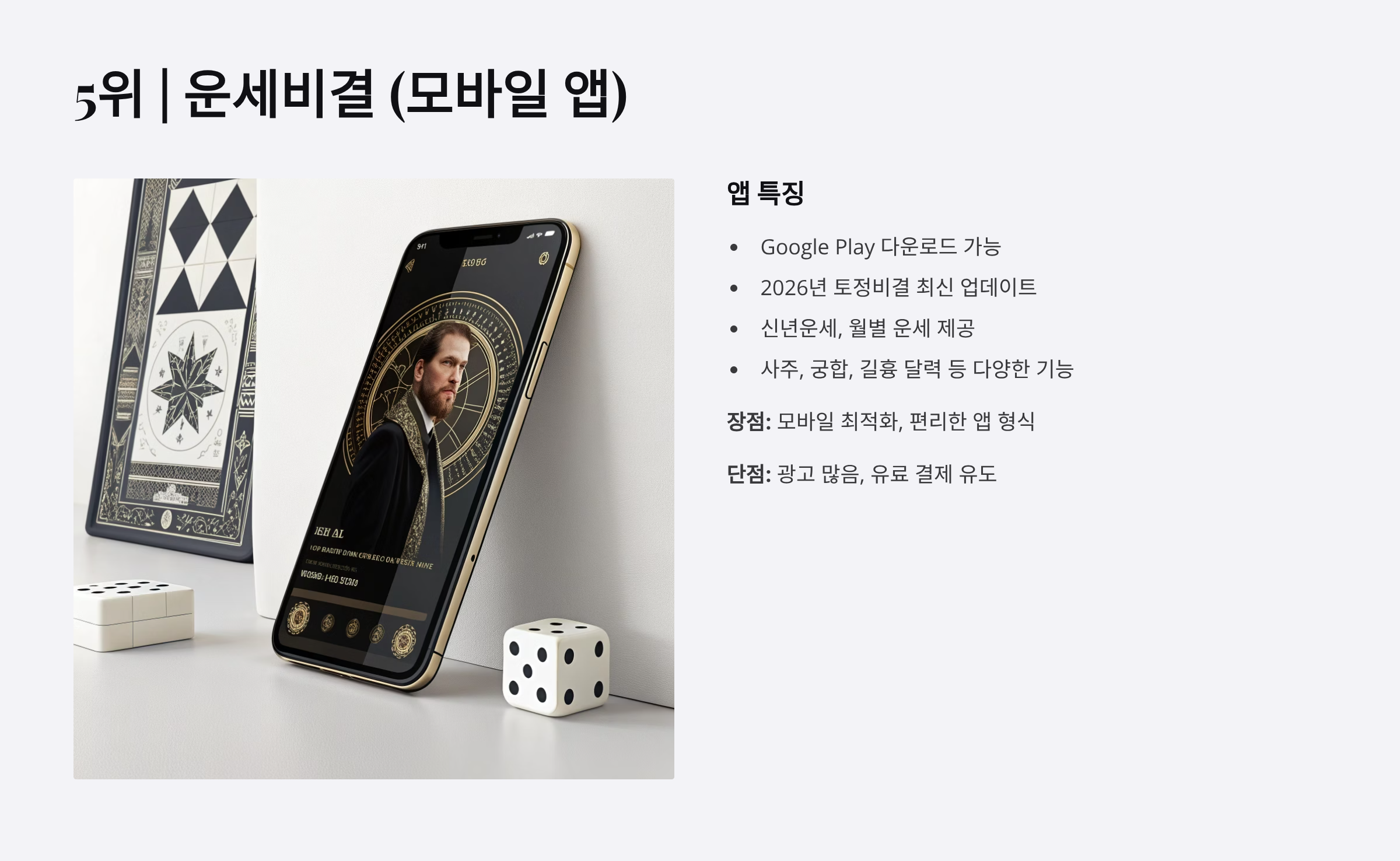 | 운세비결 앱 | ⭐⭐⭐⭐ | ⭐⭐⭐⭐ | ⭐⭐⭐⭐⭐ | ⭐⭐⭐⭐ | 앱 형식, 모바일 최적화 |