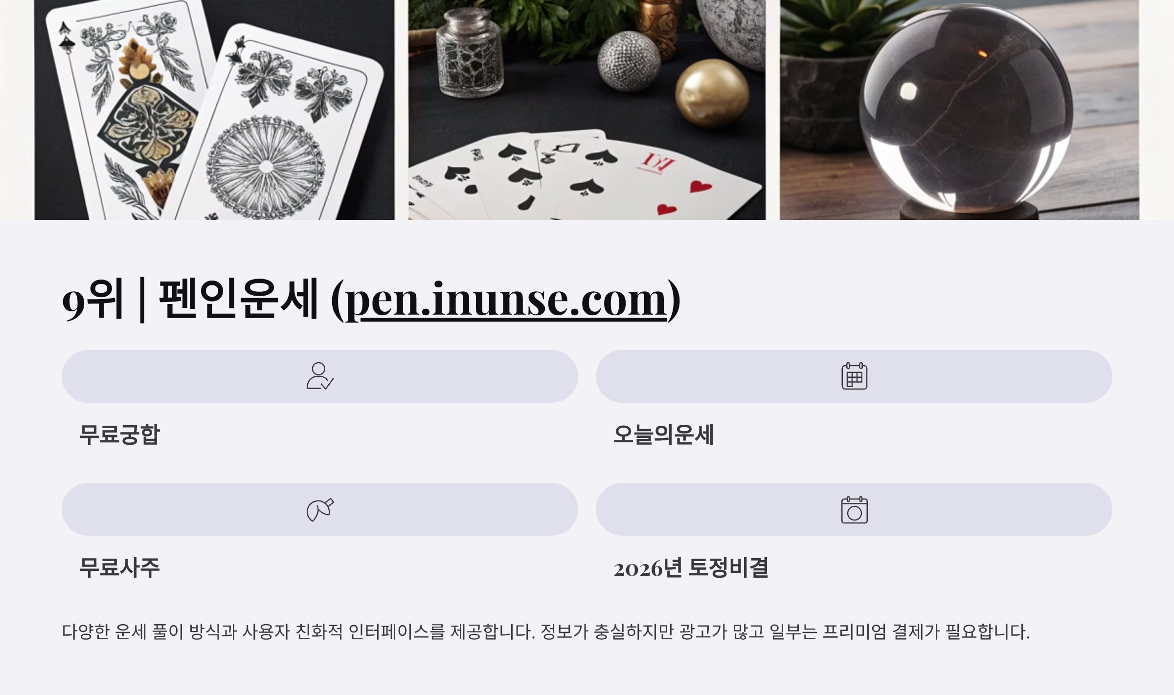| 펜인운세 | ⭐⭐⭐⭐ | ⭐⭐⭐⭐ | ⭐⭐⭐⭐ | ⭐⭐⭐⭐ | 다양한 서비스, 정보 충실 |