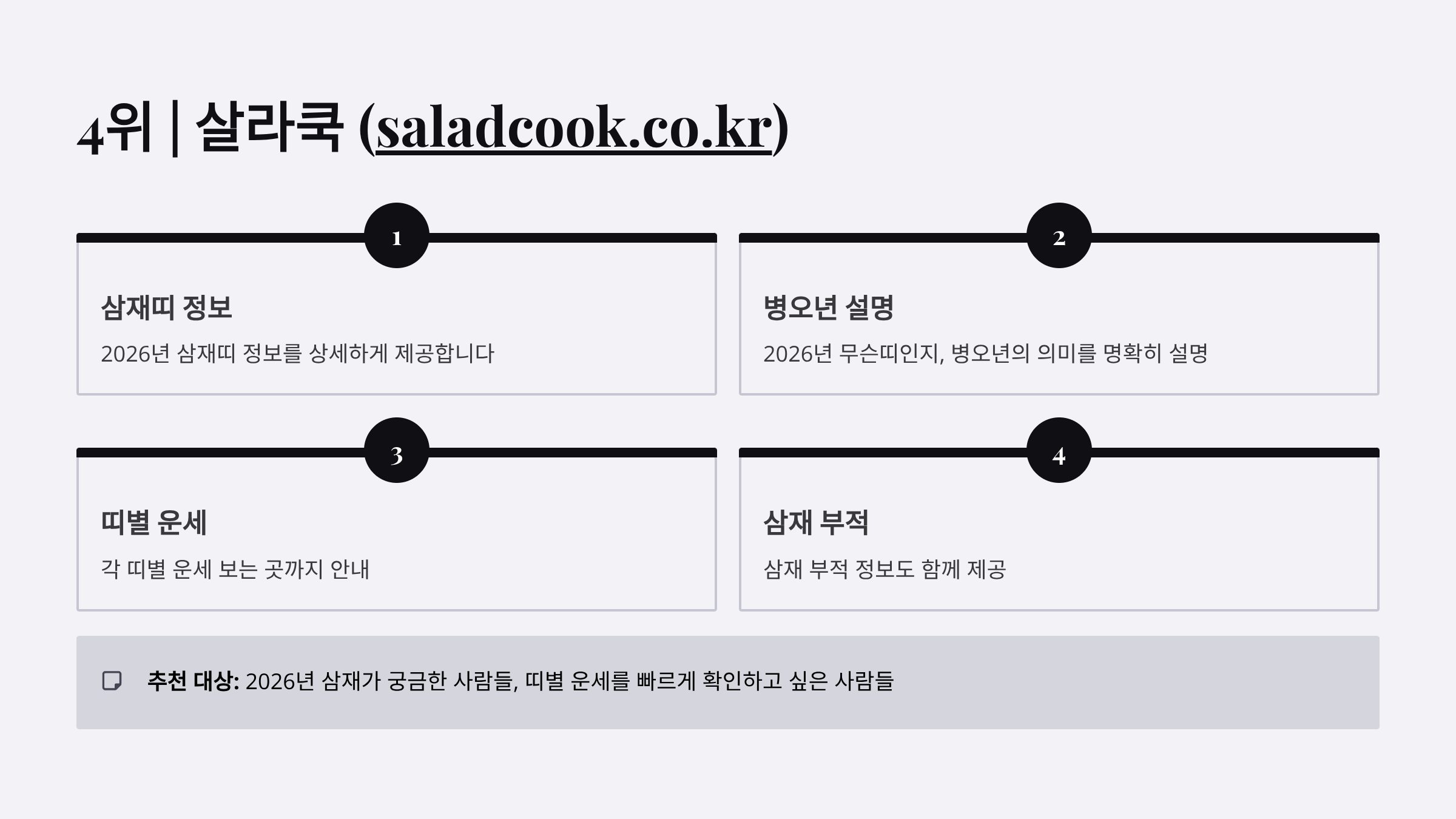 | 살라쿡 | ⭐⭐⭐⭐ | ⭐⭐⭐⭐ | ⭐⭐⭐⭐ | ⭐⭐⭐⭐ | 삼재 정보 충실, 2026년 특화 |